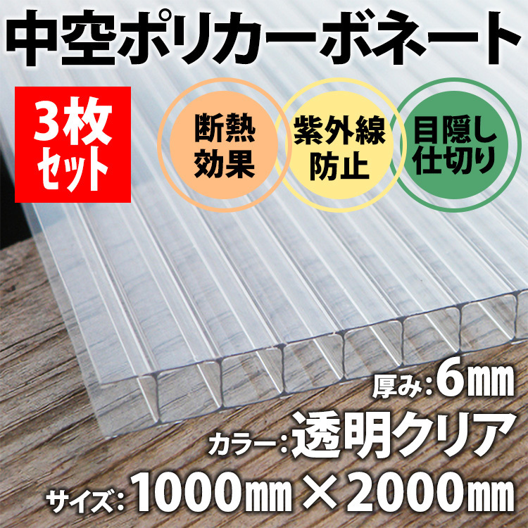 新品未使用 中空ポリカ 3枚セット 透明クリア ポリカーボネート DIY 厚み6mm 1m×2m 透明べニヤ プラスチックベニヤ 養生