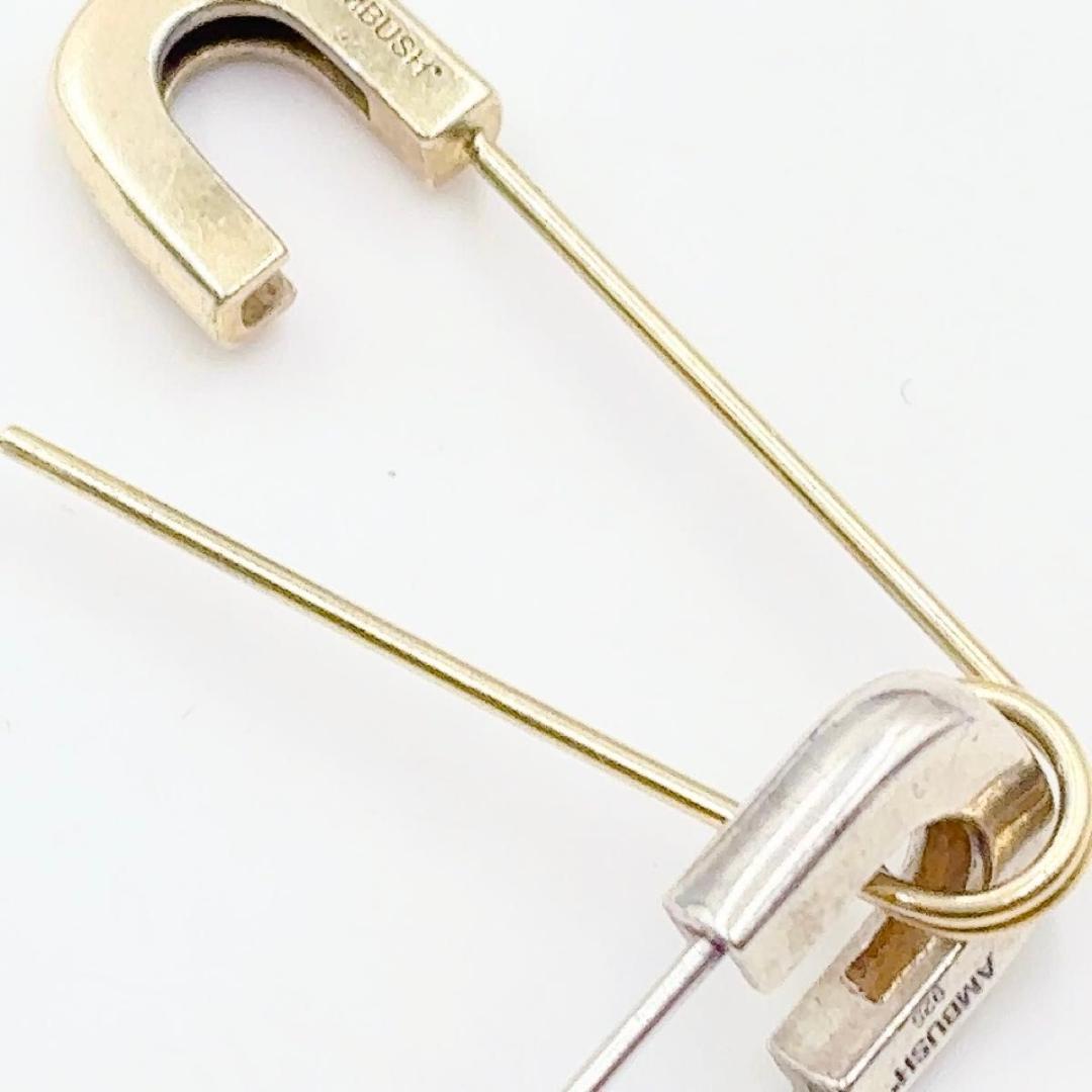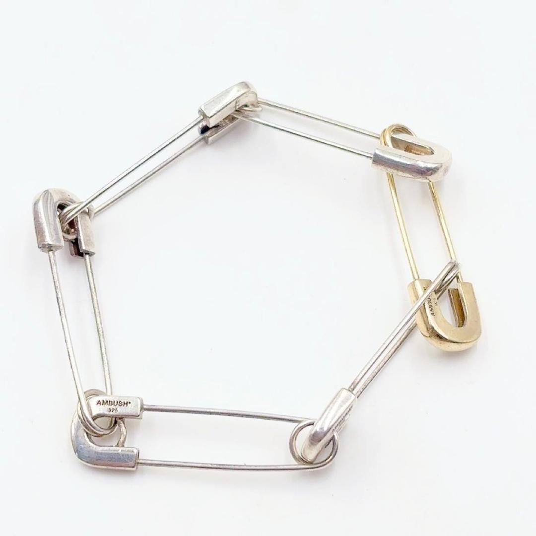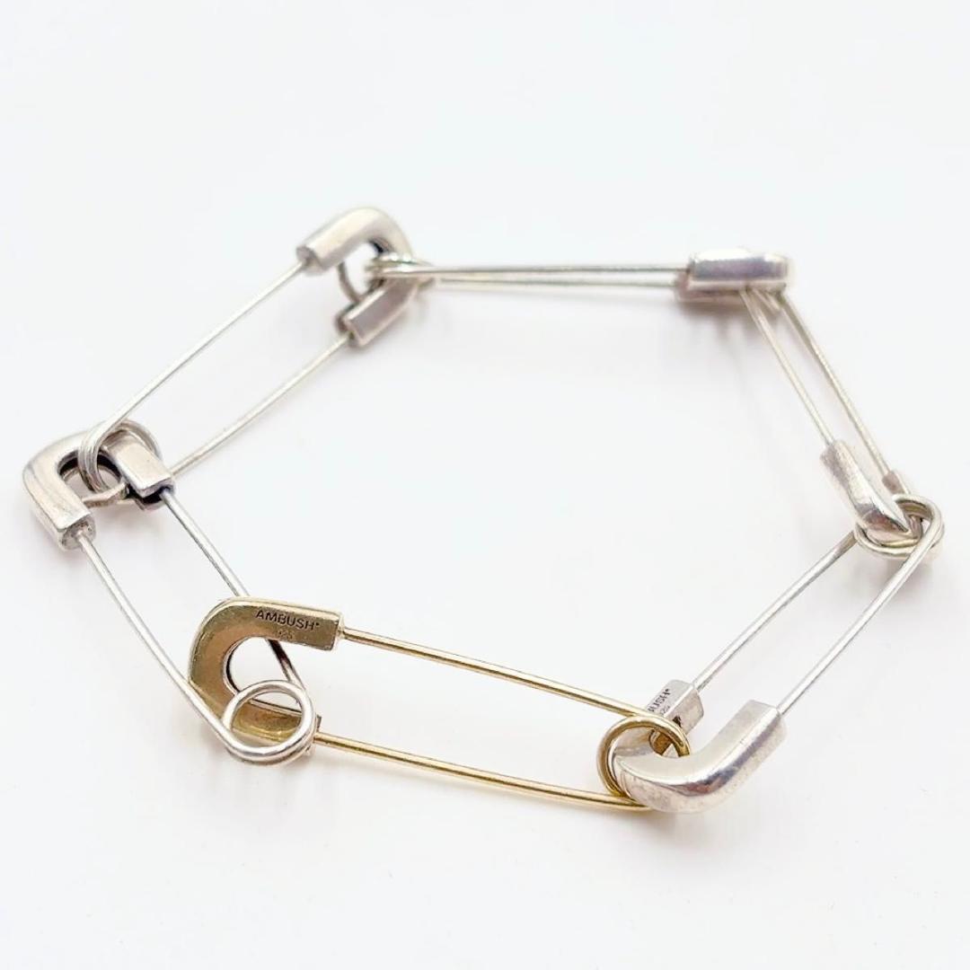 AMBUSH の SS22 コレクションの一部であるこのブレスレットは、目を引くステートメント ピースを形成しています。 シルバートーンのデザインは、シルバートーンの安全ピンで作られたチェーンリンクと、コントラストのあるゴールドトーンの安全ピンが追加されたステートメントを特徴としています。