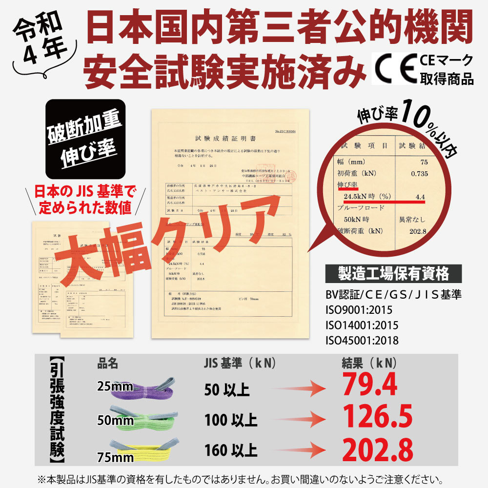 仕様: ●国際基準CE、TVU、GS規格品 ●最大使用荷重(kg):1200(ストレート吊の場合) ●全長(m):1 ●ベルト幅(mm):35 ●両端アイ形 ●材質:ポリエステル原糸100% ●安全係数6 ●PL(生産物弁償責任)保険加入商品 ●生産国:中国 用途: ●鋼材:メッキ・塗装などの表面加工鋼材・鋼管・鋼板などの運搬。 ●機械:自動車および自動車部品・精密機械の運搬。 注意事項: ●下記各最大使用荷重を超える吊り荷は絶対に吊らないでください。 ●繊維製品ですので寸法に多少の誤差があります。ご了承ください。 ●荷物の鋭利な角や摩擦によってベルトスリングなどの繊維スリングを傷つける恐れがある箇所には、必ずコーナーパットなどの当て物を使用してください。 ●当て物を使用していても荷物の横滑りや周囲の壁や物への接触、加圧などによりスリングが損傷および切断する可能性がありますので作業環境には十分に注意してご使用ください。 |
