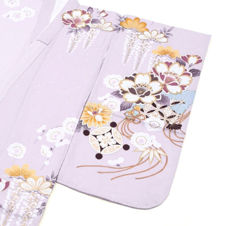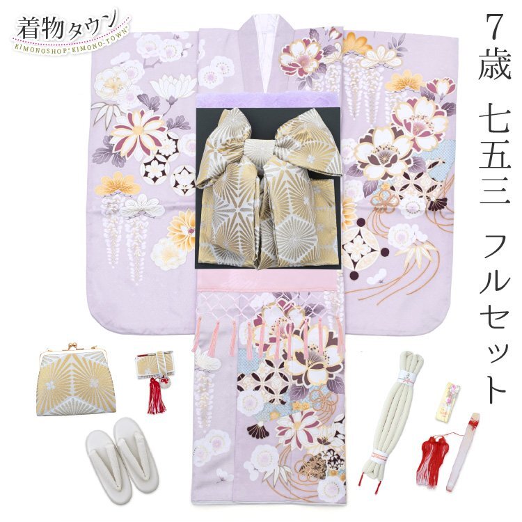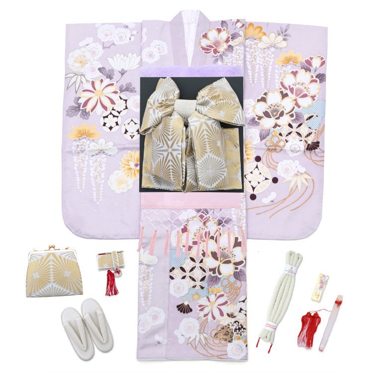 商品説明 | 着物・重ね衿・長襦袢・結び帯・草履・バッグ・筥迫・末広・帯締め・かんざし・帯揚・しごき・足袋・子供用腰紐3本が付いたフルセットです。 |