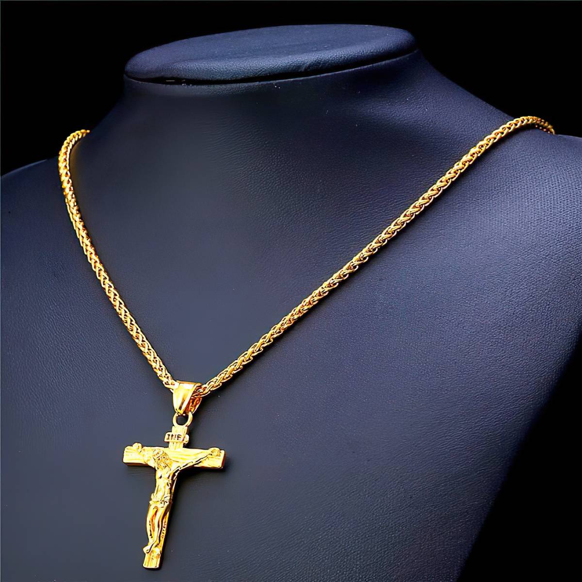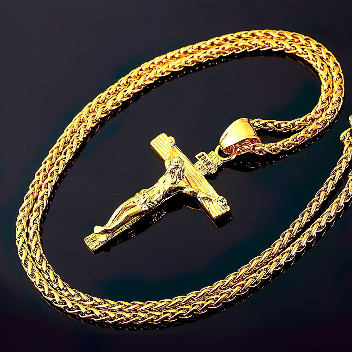 こちら黄金色の十字架、キリストを模したK18GFゴールドネックレスとなります。