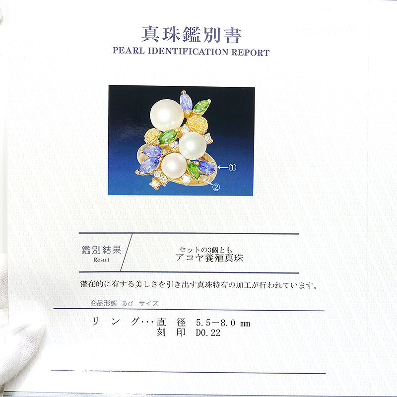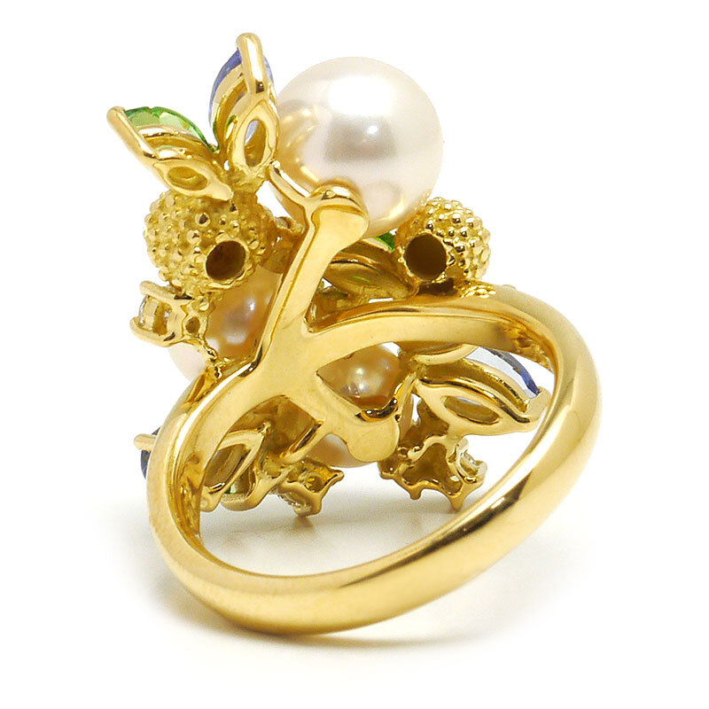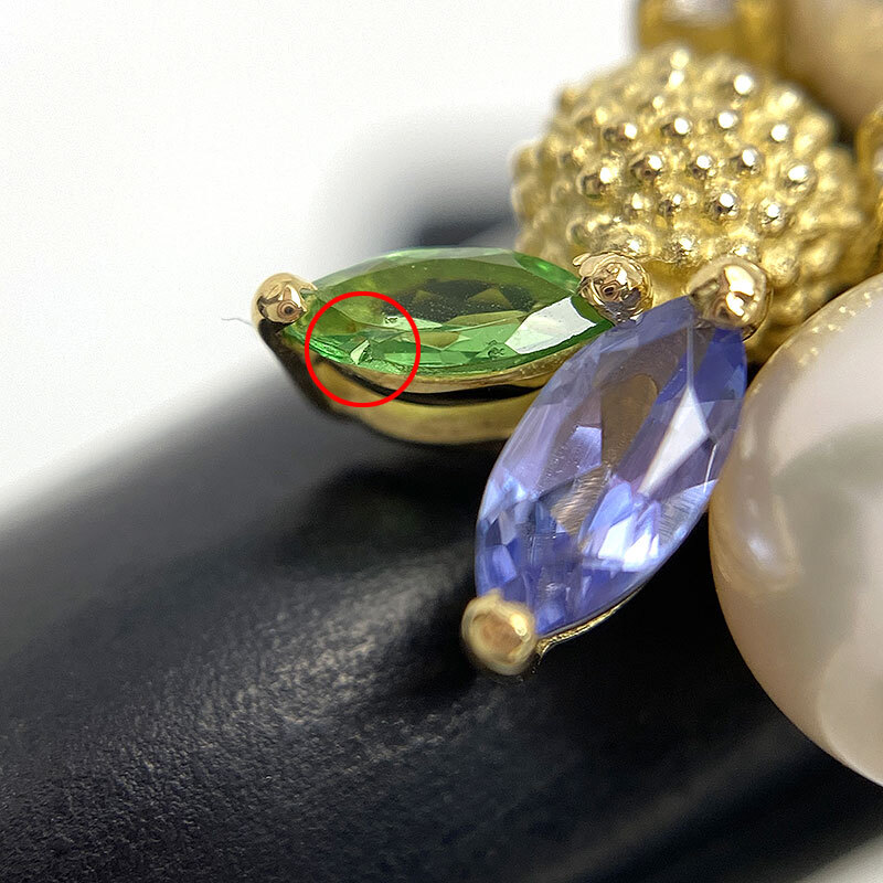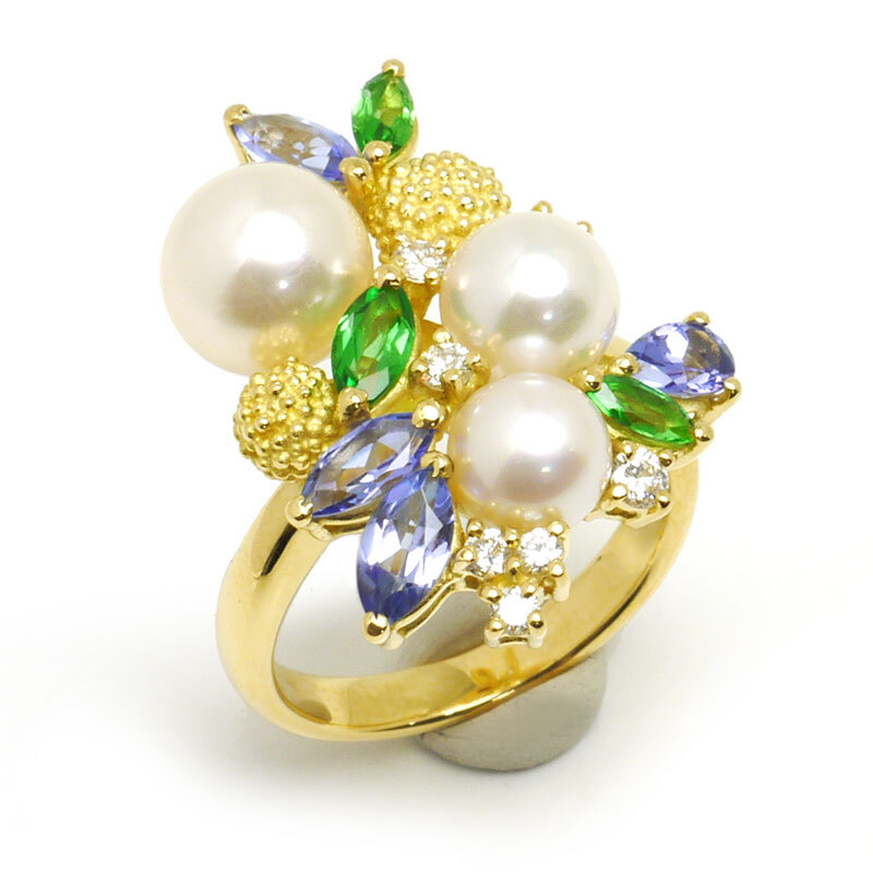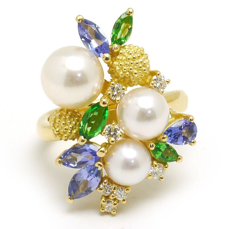 素材:K18YG(イエローゴールド)・アコヤ養殖真珠5.5-8.0mm・ダイヤモンド0.22ct・タンザナイト(カラット不明)・グリーングロッシュラーガーネット(カラット不明)