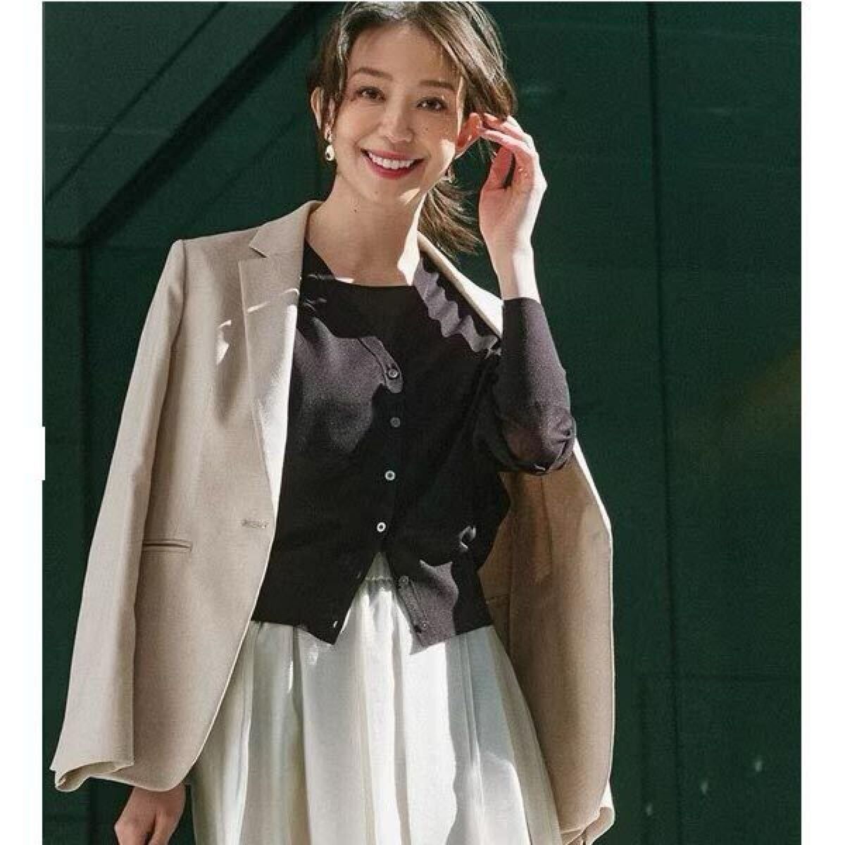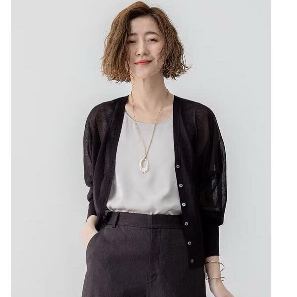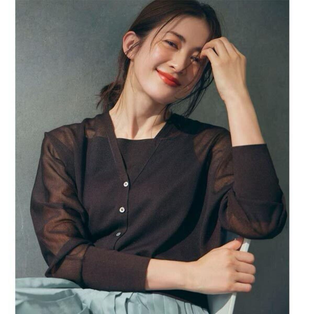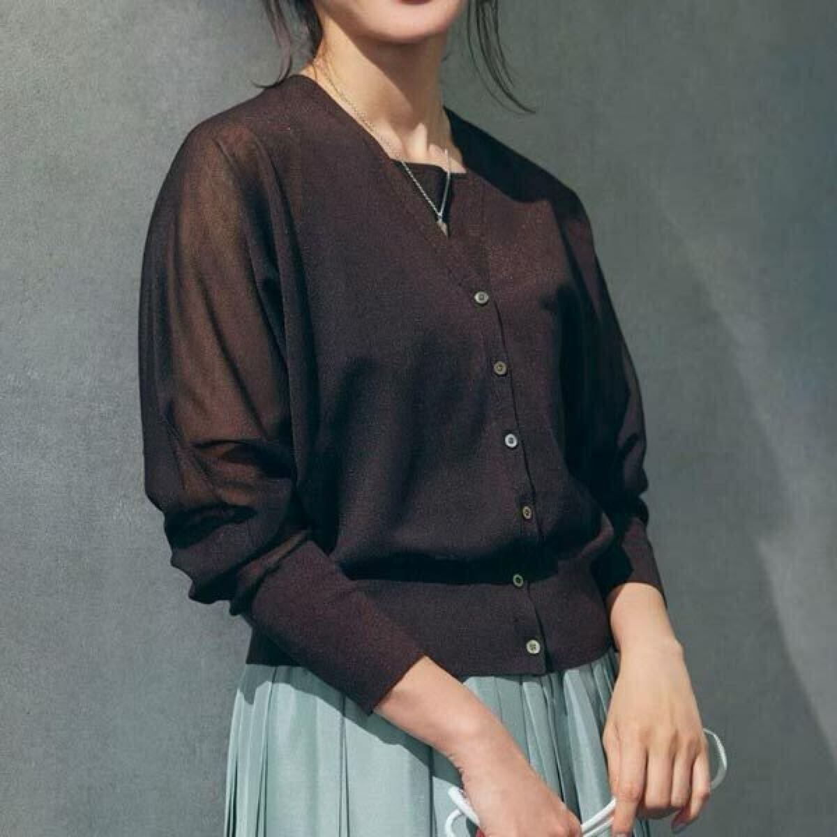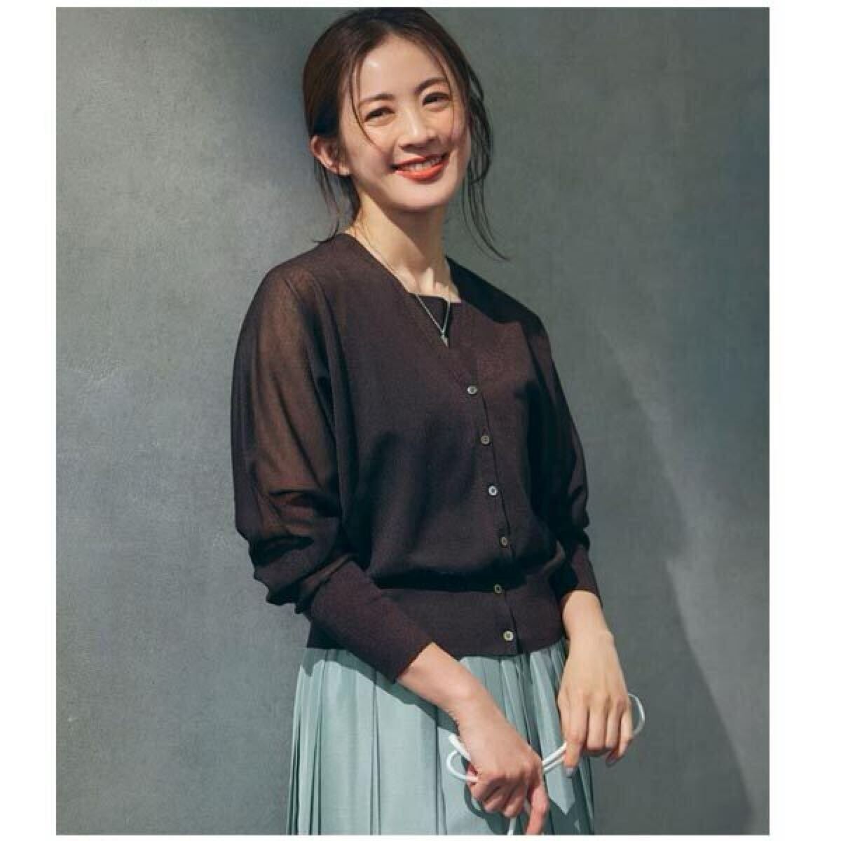 23区の【杏さん着用】シャイニーシアー ドルマンスリーブ カーディガンです。