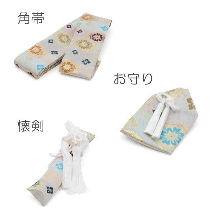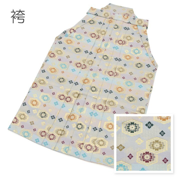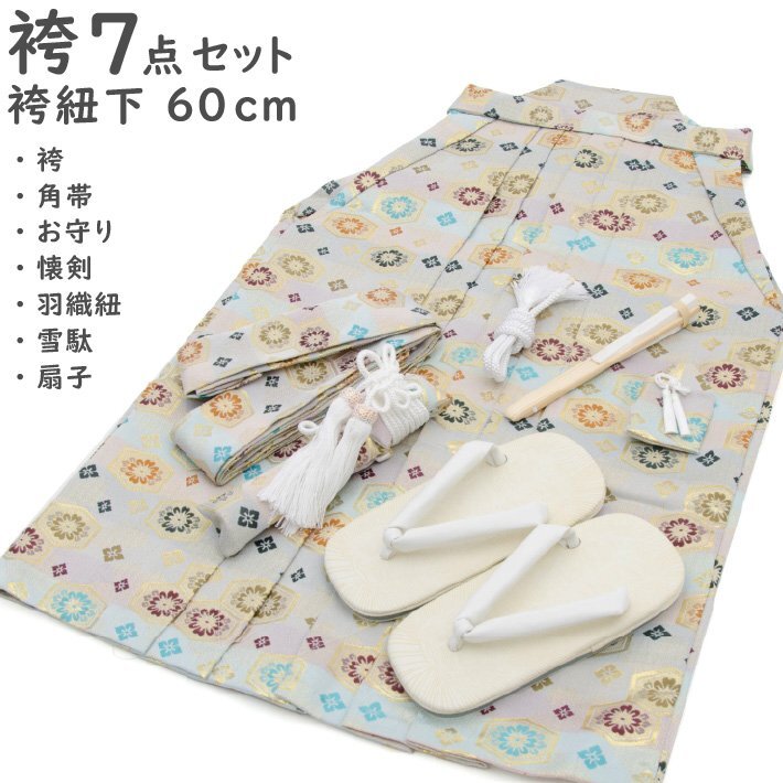 亀甲柄の袴の7点セットになります。 (1)袴 (2)角帯 (3)雪駄 (4)扇子 (5)懐剣 (6)羽織紐 (7)お守り |