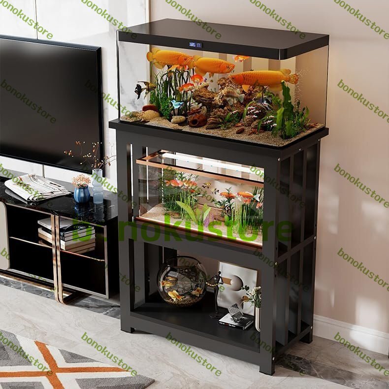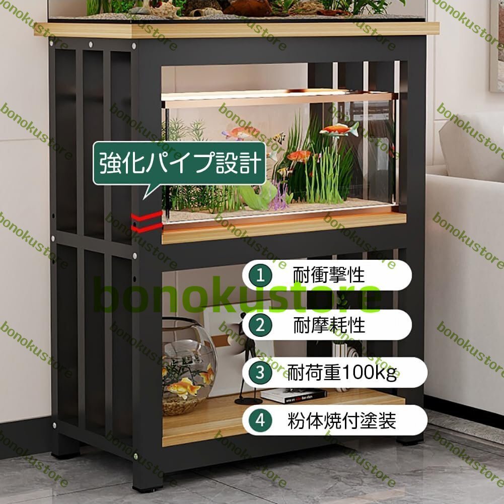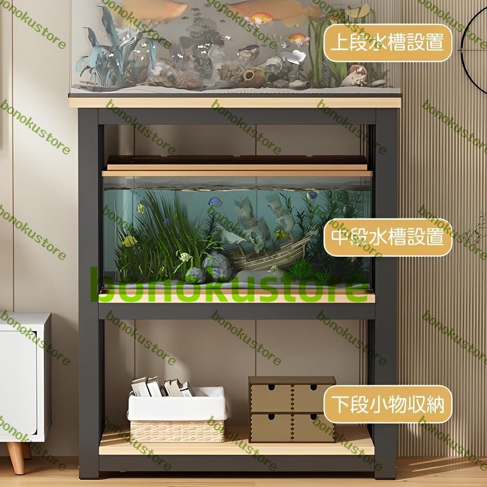 シンプル三段式デザイン:上段、中段は水槽用の頑丈な木製天板、下段は別のアイテムを置ける便利なスペース。シンプルながら実用的な設計です 安定構造:太い金属フレームと強化複合天板で、耐荷重100kgを実現。揺れず安定した使用感で、安心して設置可能です 防水・耐熱・耐