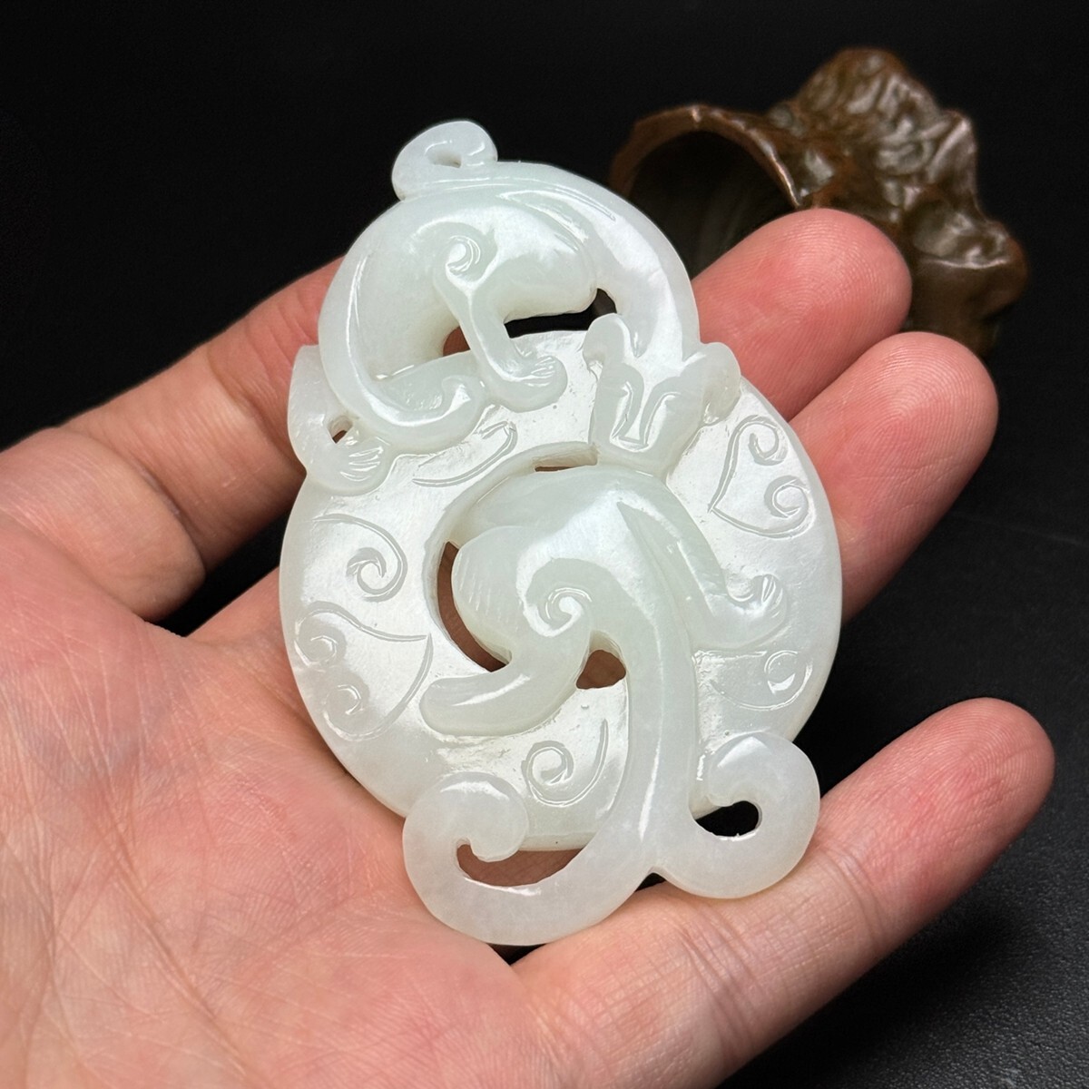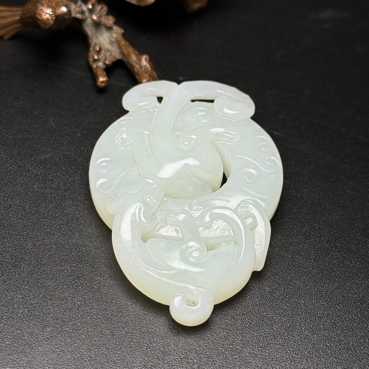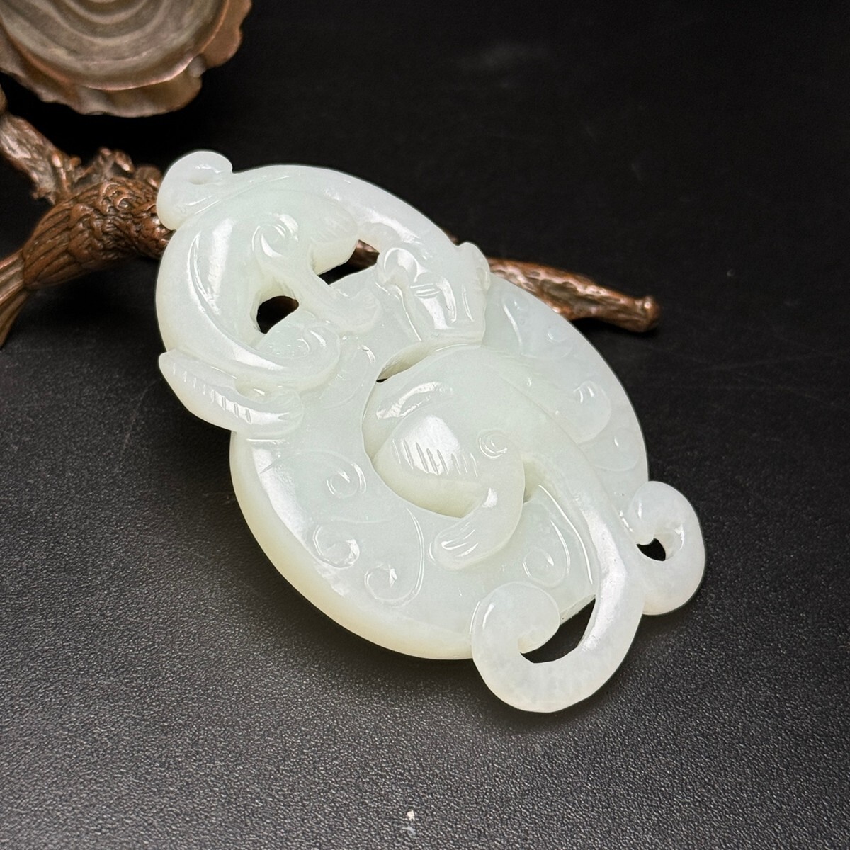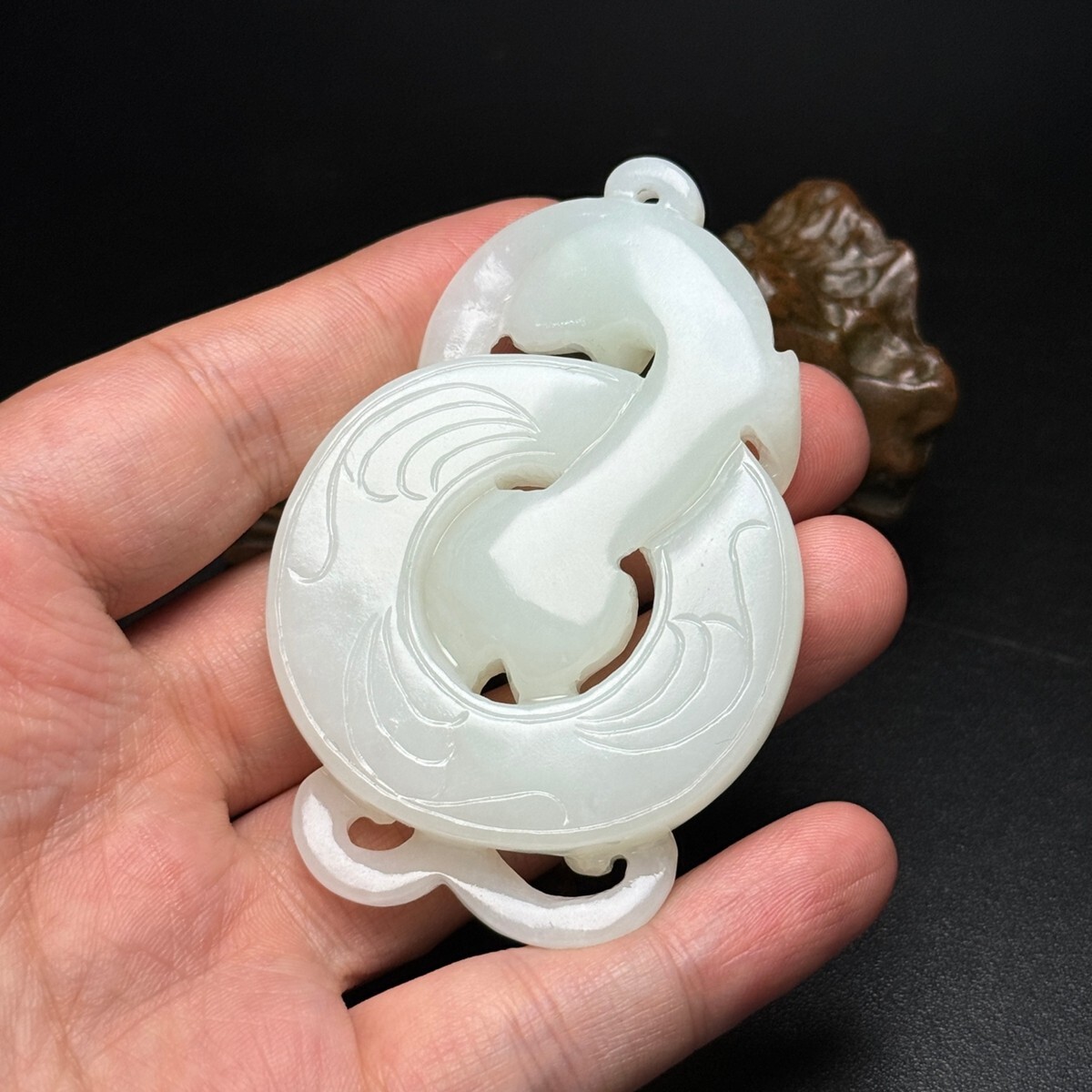 「時代物 和田玉 白玉彫り 龍行天下 招財納福 魑龍穿環玉佩」極細工 裝身具 賞物 中国古美術 旧蔵出