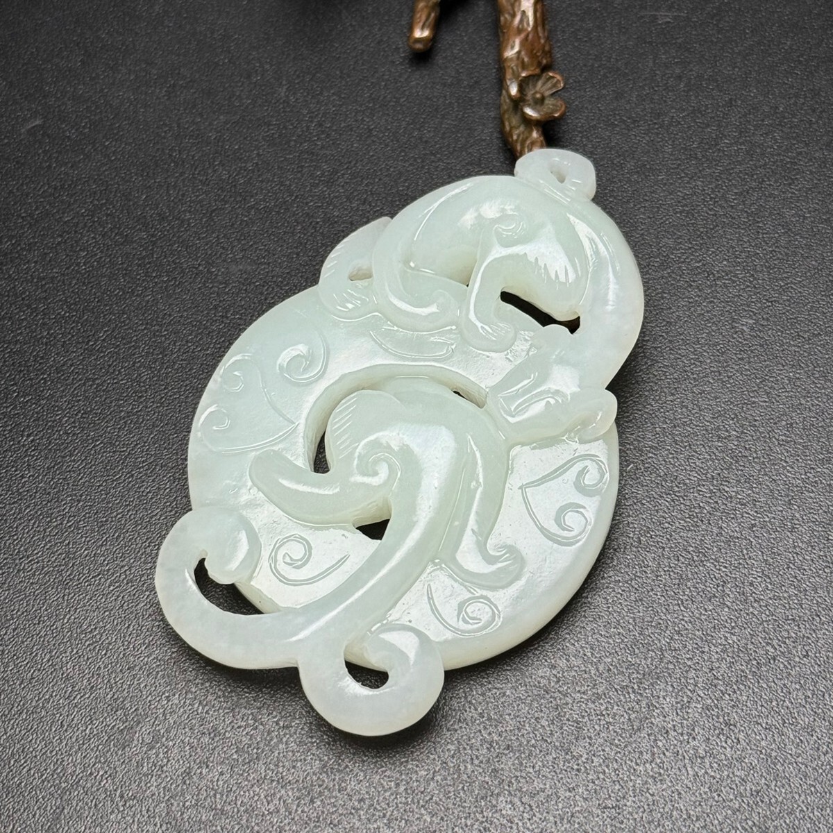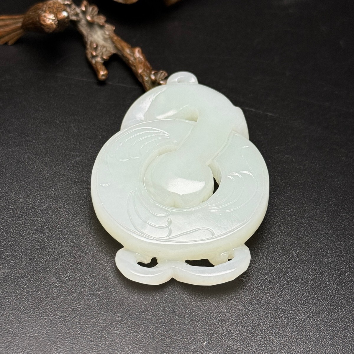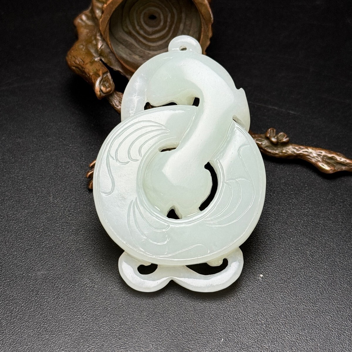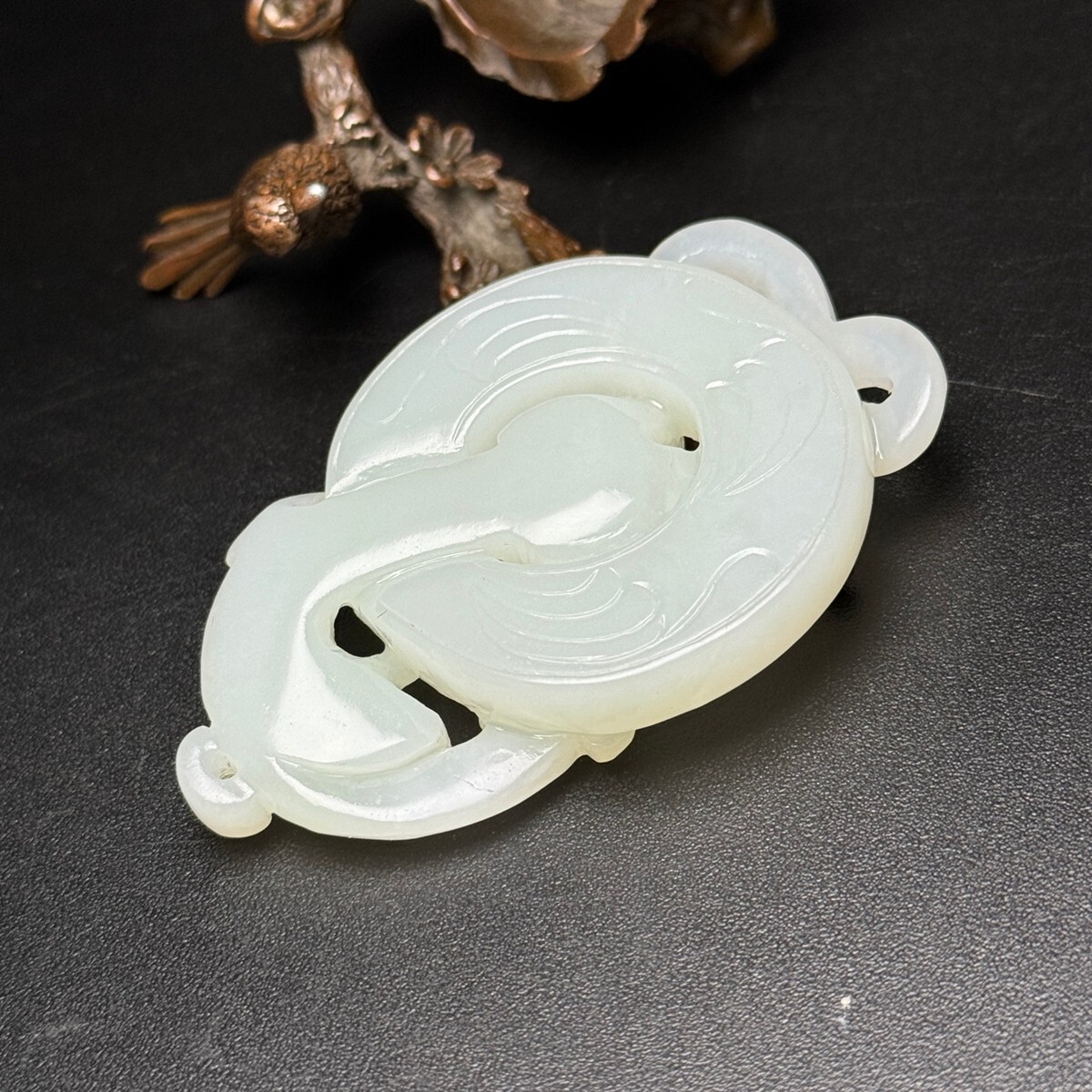 「時代物 和田玉 白玉彫り 龍行天下 招財納福 魑龍穿環玉佩」極細工 裝身具 賞物 中国古美術 旧蔵出