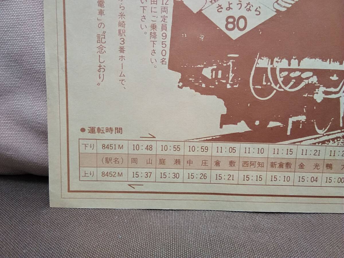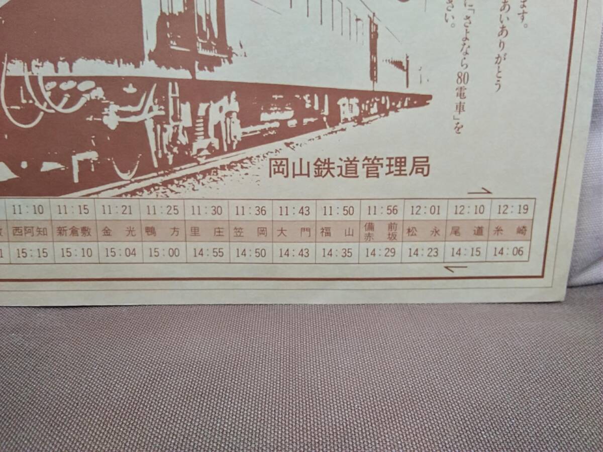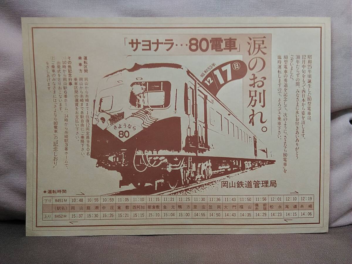チラシ 「サヨナラ・・・80電車 涙のお別れ。」 岡山鉄道管理局 80系 クハ86 国鉄 日本国有鉄道 8451M 急行 湘南電車 方向幕 サボ