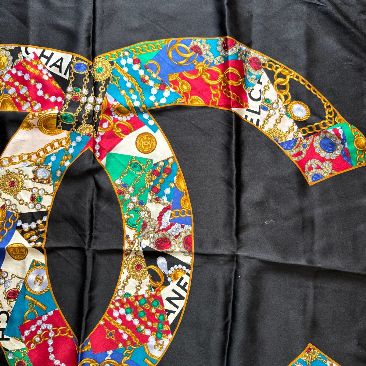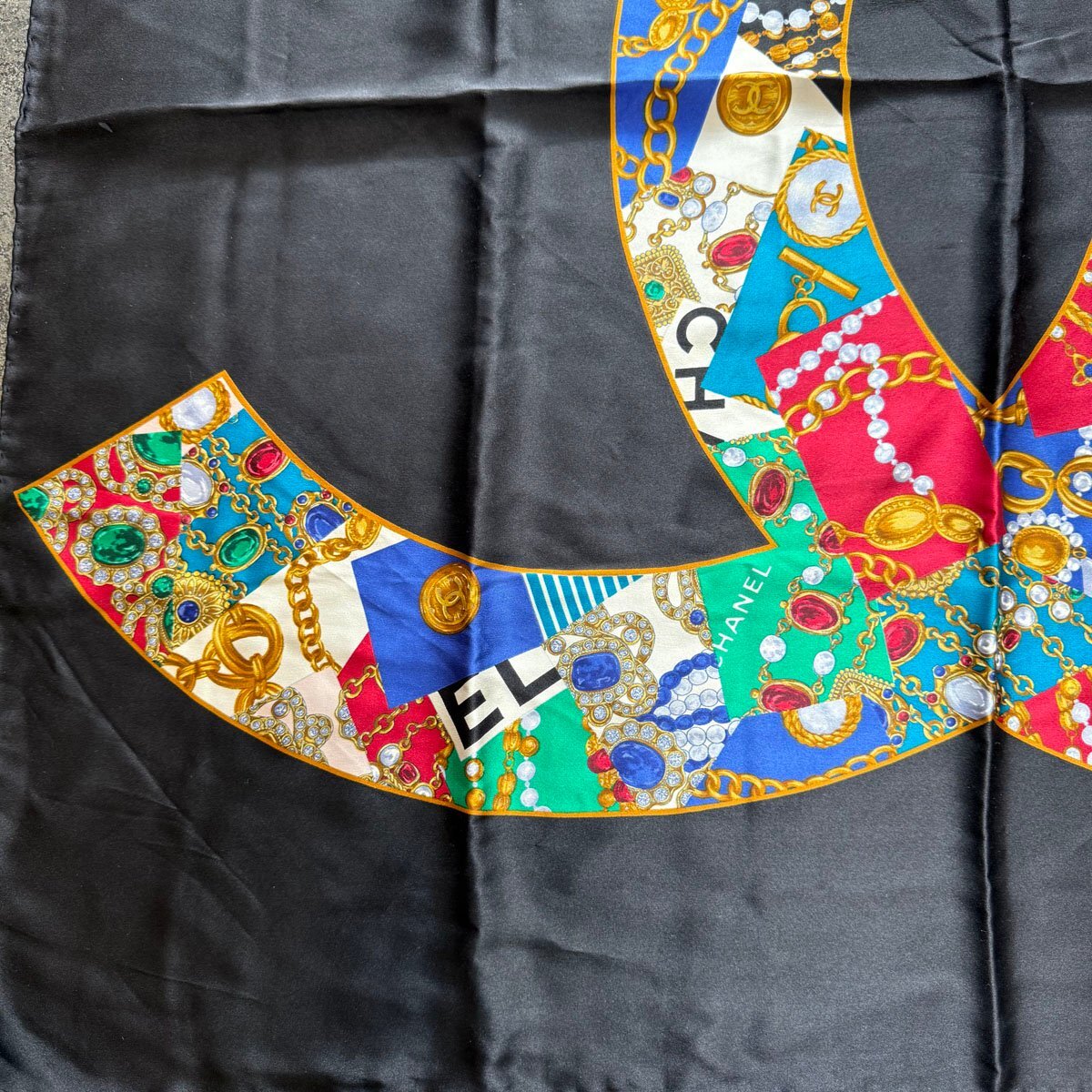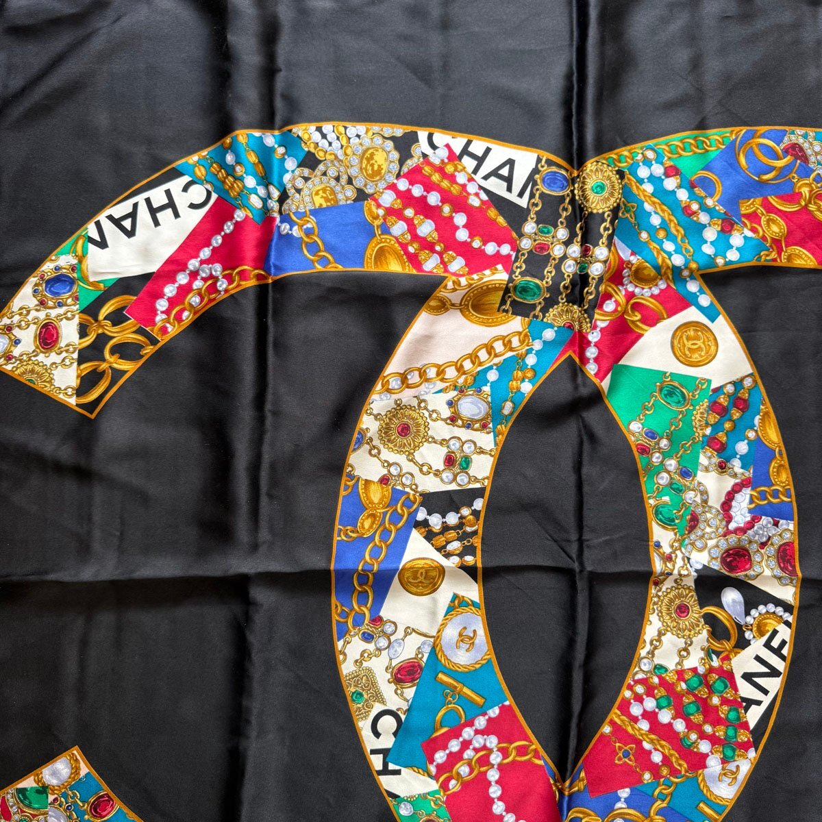 ◆シャネル◆シルク100% 大判スカーフ ココマーク ジュエリー柄 ブラック グリポワ 中古