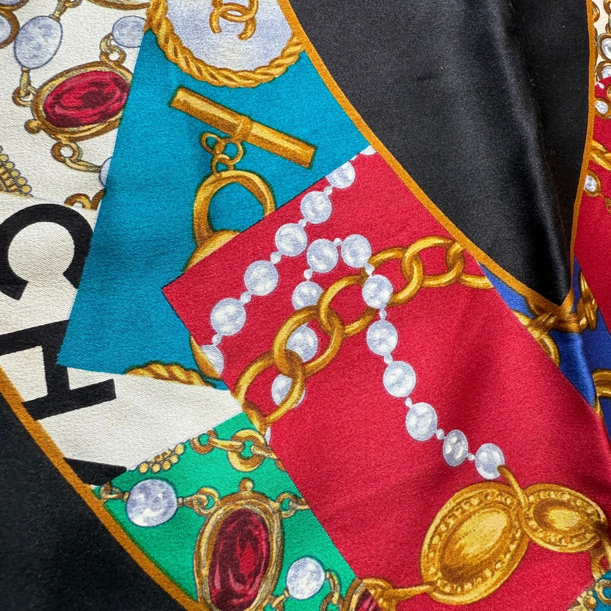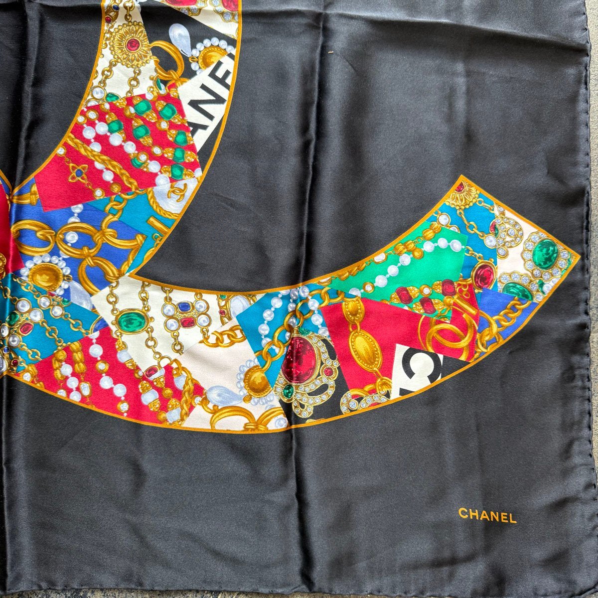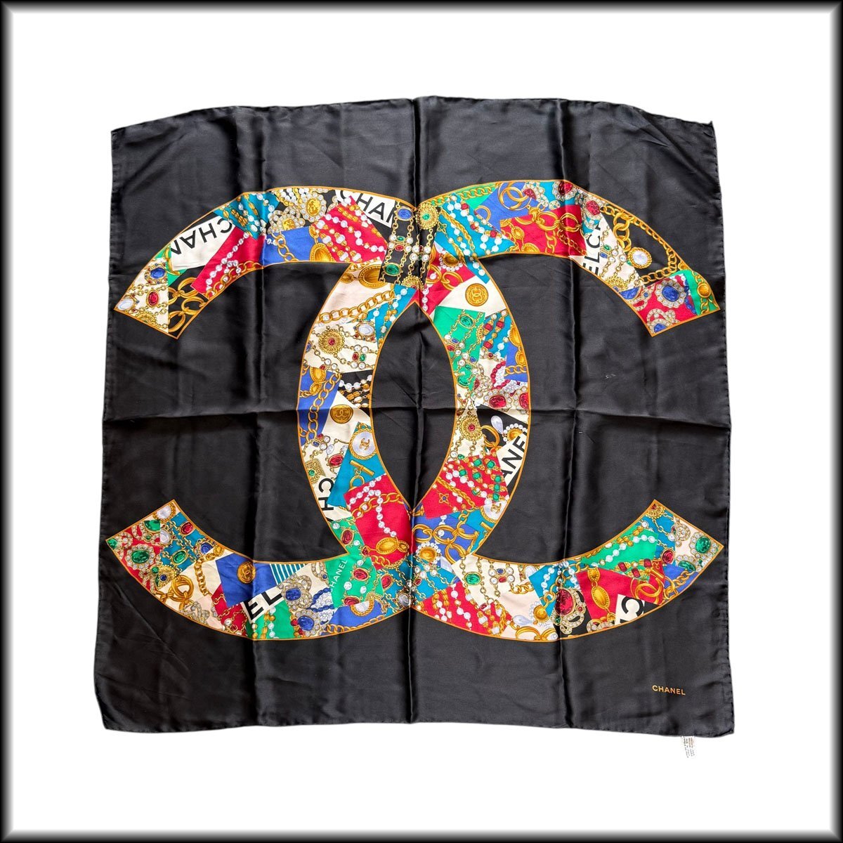 ◆シャネル◆シルク100% 大判スカーフ ココマーク ジュエリー柄 ブラック グリポワ 中古