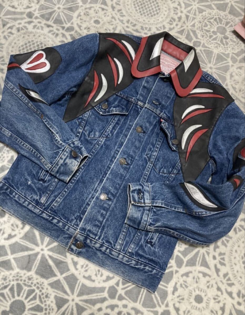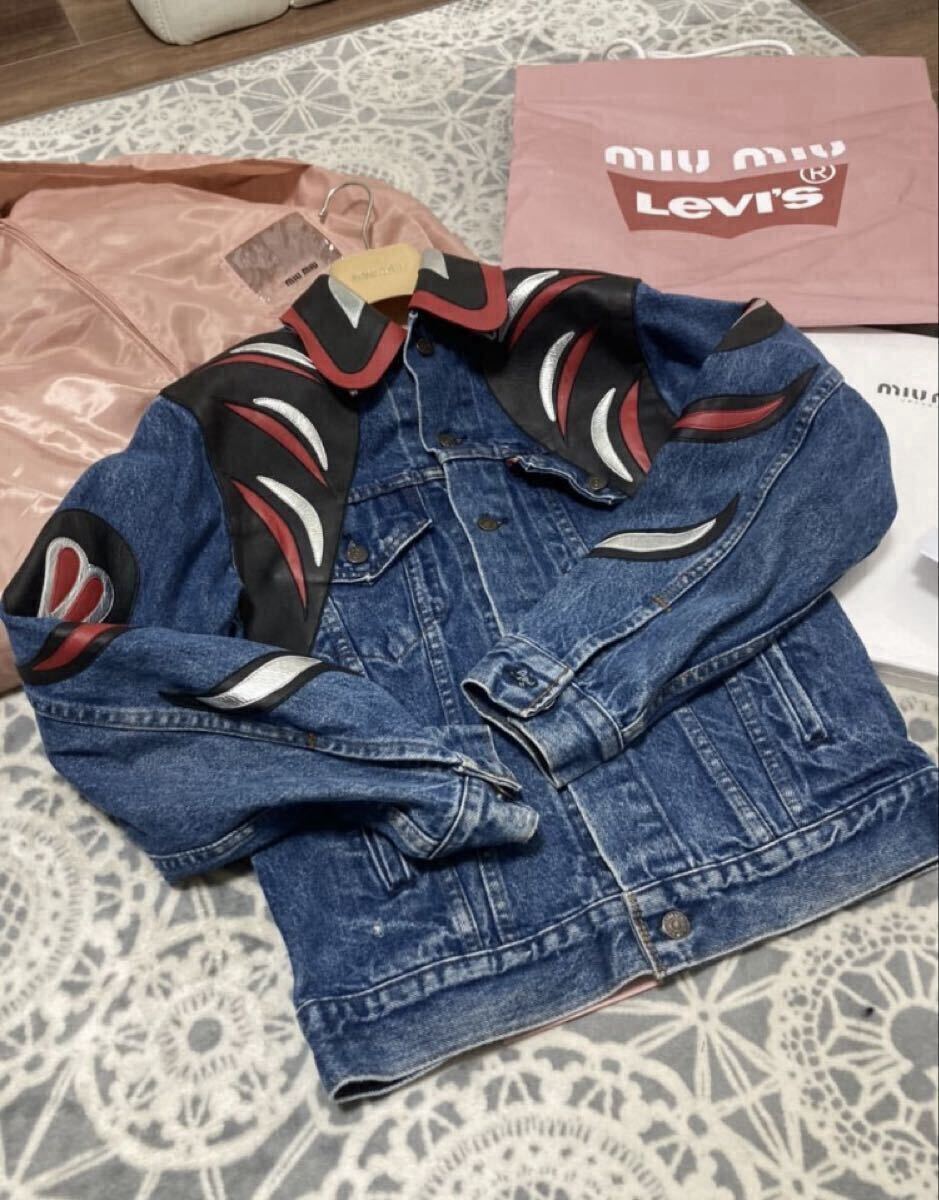 リーバイスらしいヴィンテージな雰囲気とミュウミュウの個性的なレザーパッチワークがマッチしたファッショナブルなデニムジャケットです。