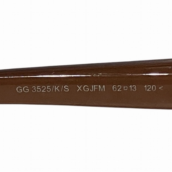 【ブランド】グッチ 【ライン】インターロッキングG 【型番】GG3525 【カラー】ブラウン 【素材】プラスチック 【サイズ】レンズ:H約5.3cm×W約6.5cm、テンプル約10.5cm 【付属品】ケース、眼鏡拭き 【ランク】B (使用感あり) 【状態】 レンズの状態:擦れ、小程度有り 金具の状態:擦れ、傷、変色、小程度有り 付属品の状態:擦れ、小程度有り その他コメント:62□13 120 | |