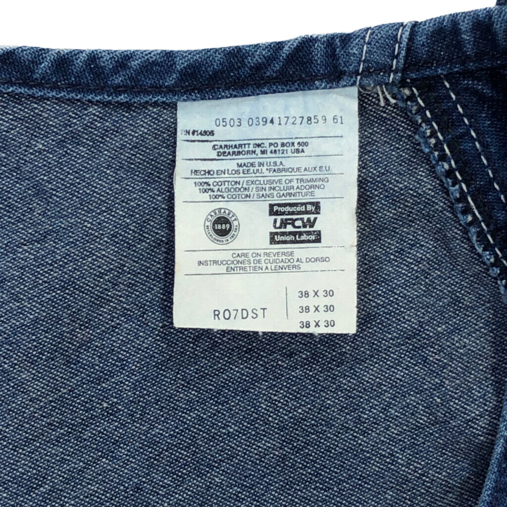 【商品管理番号】 S6810 【ブランド】 Carhartt/カーハート 【サイズ】 W38 L30 【実寸サイズ】 総丈:約151cm ウエスト:約110cm 股上:約37cm 股下:約68cm わたり幅:約38cm 裾幅:約27cm 【主な素材】 表地 : コットン 【色】 ブルー 【仕様】 生産国 : USA製 00年代 2003年 ビブオーバーオール 【状態】 汚れ:胸、背中、ヒップ、もも |