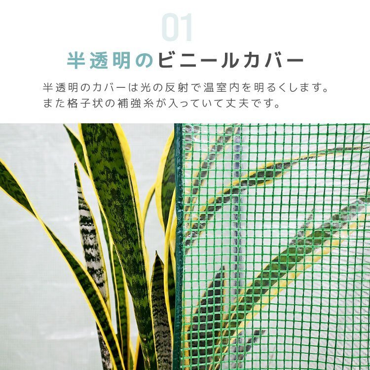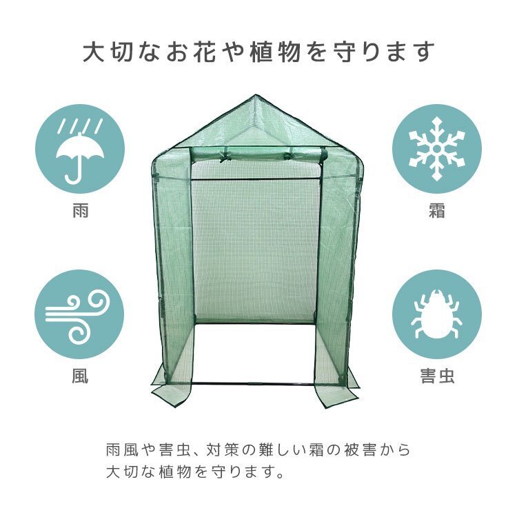 お庭やベランダでガーデニングを楽しみたい方のマストアイテム! 簡単設置!通気性抜群!オールシーズン活躍のガーデンハウスです。 ■オールシーズン、大切な植物を守ります! 冬?春先にかけては、ビニール温室に入れてあげることで、 冷たい風や雪、霜などが、直接当たるのを防ぎます。 屋外飼育のメダカ・金魚の越冬や雨避けにもビニール温室が最適! 猫や鳥などの外敵からも守ります。 ビニールカバー前面には両サイドファスナーが付いているので、 冬場でも温室内の温度上昇が気になる時には、ビニールを巻き上げ風通しを良くするなど、 天候に合わせて調節できます。 カバーを固定できる紐つき仕様となっており、巻き上げて作業しやすいように固定できます。 ■工具不要で簡単に組み立て 組立時に道具不要!パイプを差し込むだけで簡単に組み立てができます! 転倒防止のペグ付きで、安全にご使用頂けます。 ■商品コード:AAH007GR ■商品仕様 サイズ(約):幅125×奥行き95×高さ190cm 重量(約):3.3kg 素材:ビニール(カバー)、スチールパイプ(フレーム) 付属品:ロープ×4、ペグ×4 ■注意事項 ・お客様組立の商品です。 ・強風の際には外での使用をお控えください。 ・組立て方や商品の個体差により、サイズは若干差異が生じる場合がございます。予めご了承下さい。 ・商品は、モニターによって色合いが異なって見える場合があります。 ・仕様・デザインは改良のため予告なく変更することがあります。 ■保障期間 7日間 ※商品到着後7日以内の初期不良・破損のみご対応させていただきます。 【新品未使用品です】 |