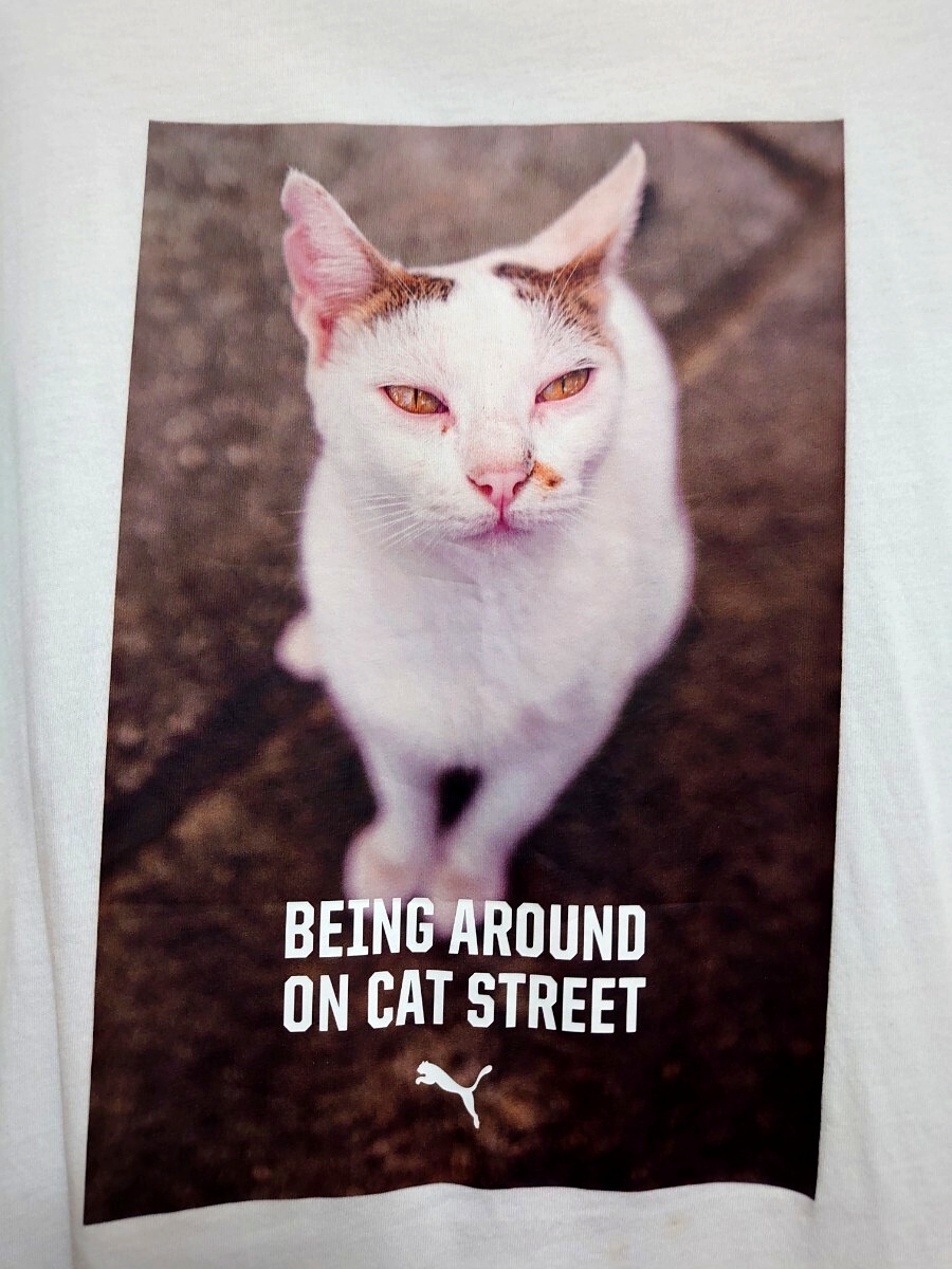 PUMA プーマ グラフィックロゴ キャット フォトプリント Tシャツ Мサイズ ホワイト 海外の猫がいる風景