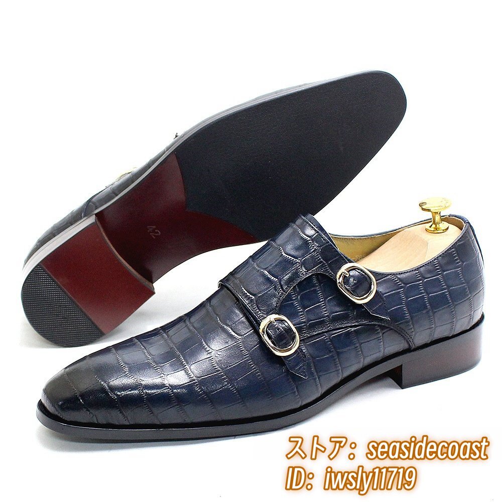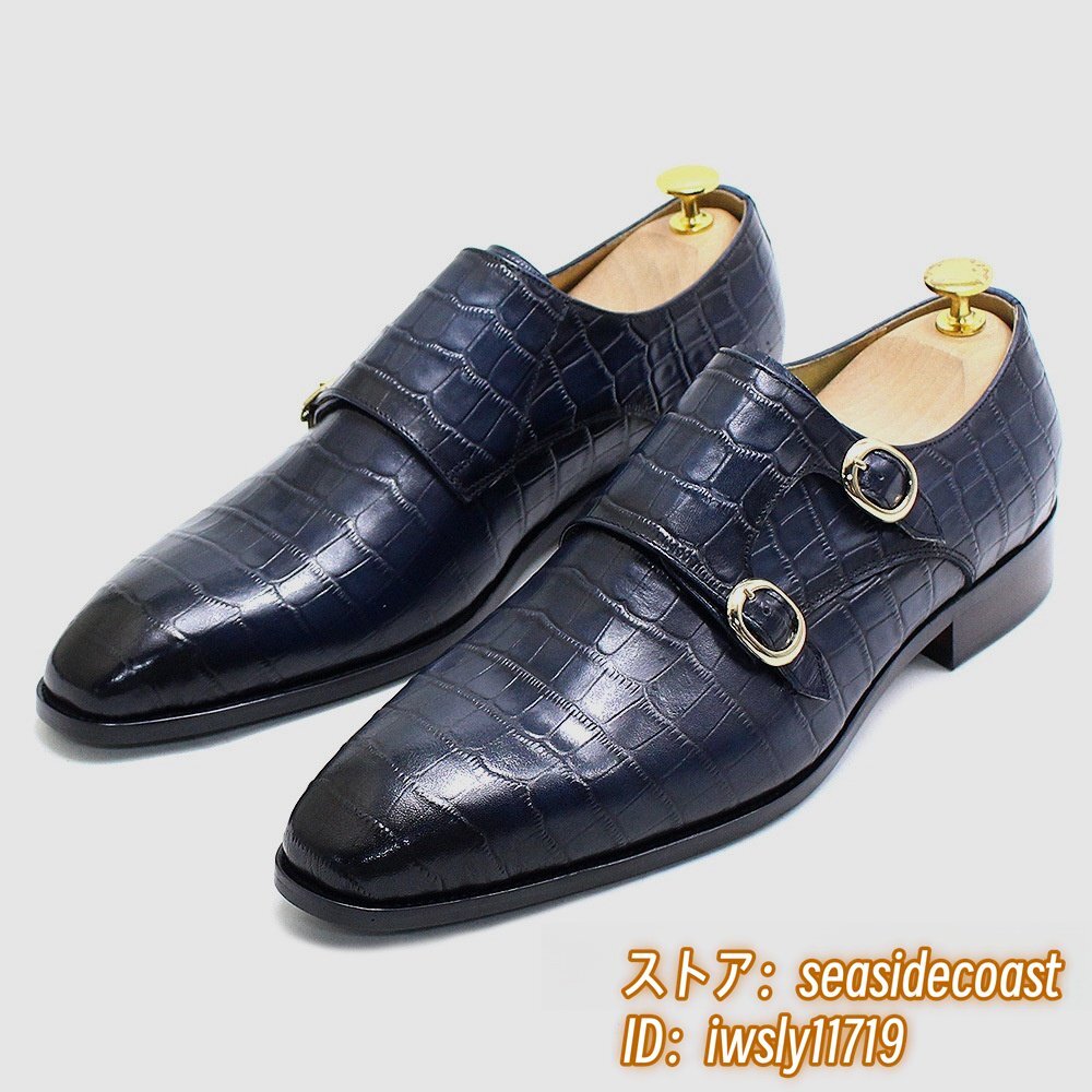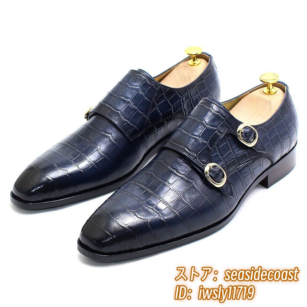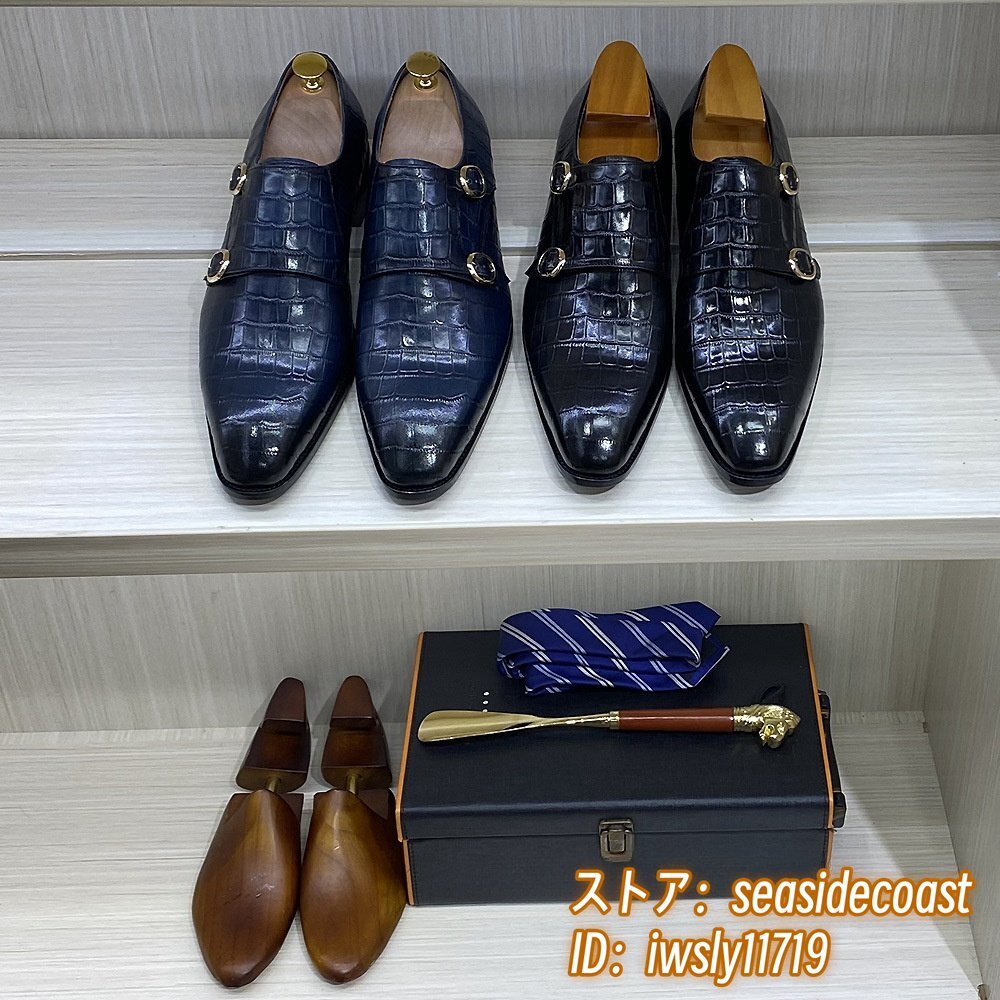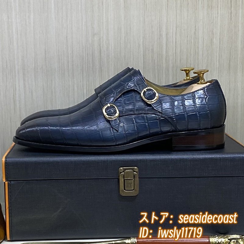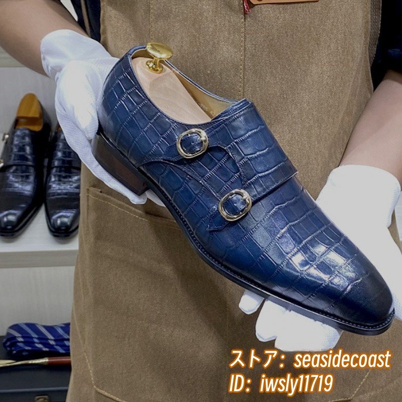 職人手作り*ビジネスシューズ 本革 レザーシューズ 新品 モンクストラップ 紳士靴 定価8万 超希少 メンズ 鰐柄 牛革 革靴 ブルー 28.0cm