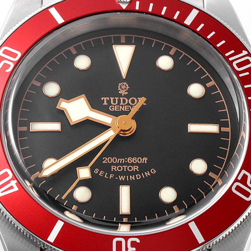 | モデル情報 | ROLEXのディフュージョンブランドとして知られるチューダー。そのチューダーの2012年の発表作ヘリテージ・ブラックベイを入荷いたしました。おなじみのイカ針に、復刻された「チューダーローズ」のロゴマーク。リュウズにはリューズガードが無く、こちらにも小バラの刻印がございます。レッドベゼル、ブラックダイアル、ゴールドのサークルラインが力強さを感じさせるモデルです。ムーブメントには自動巻きCal.2824を搭載。38時間のパワーリザーブ、200m防水。 |