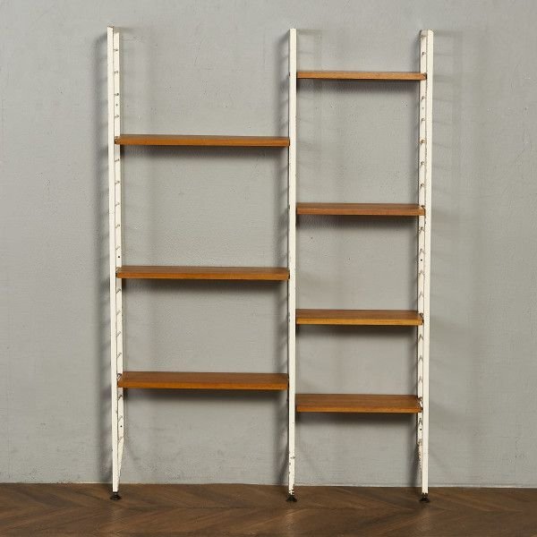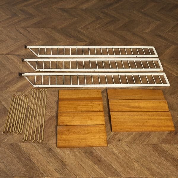 イギリス Staples & Co.Ltd 社製、Ladderax(ラダラックス) 60年代ヴィンテージ ウォールユニット シェルフです。 無骨な鉄製フレームとチーク棚板のコントラストが印象深いオープンシェルフ。お好みよって棚板を自由に組み換え設置することが可能です。 |