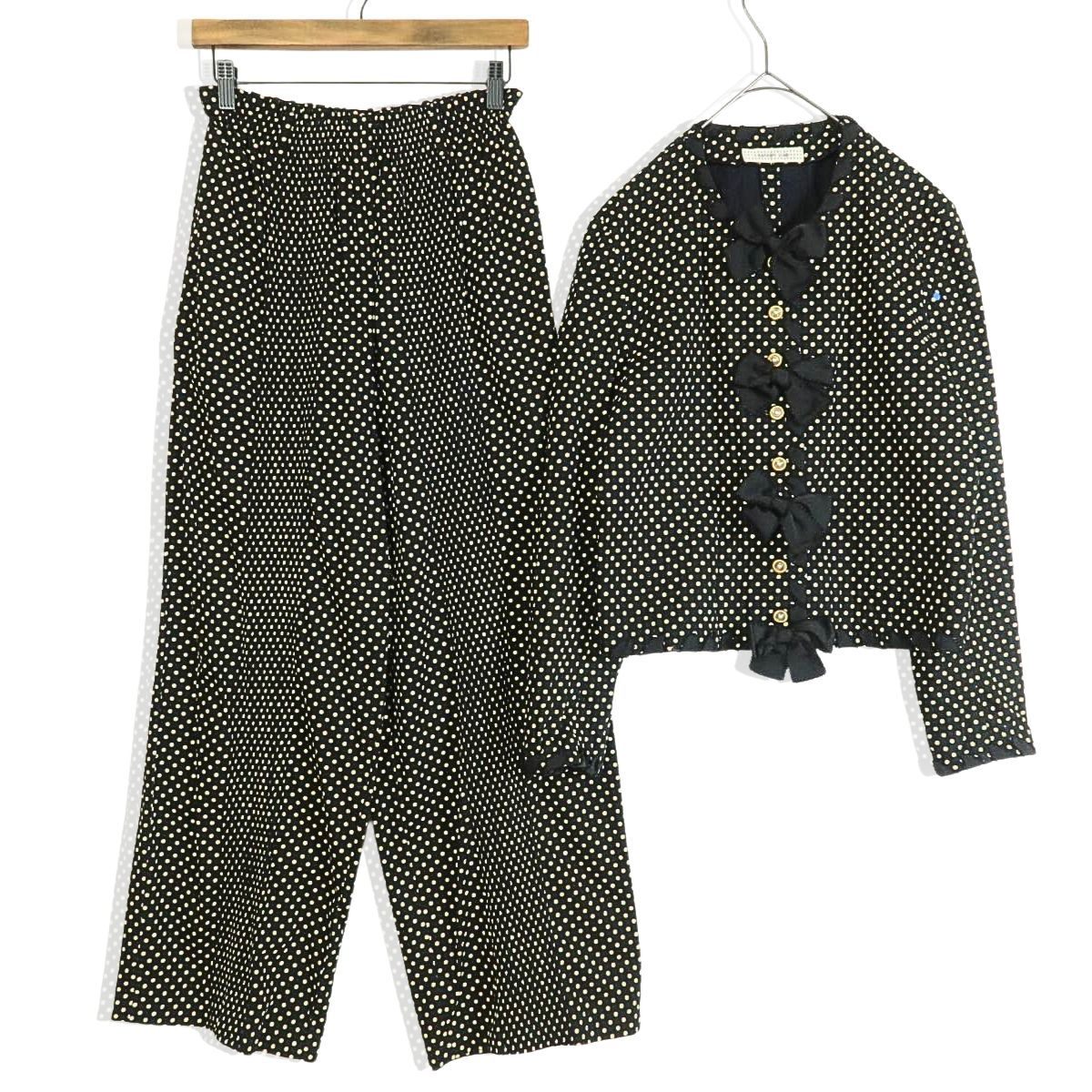 商品説明 | 【実寸約】肩幅41袖丈58バスト96着丈49(cm) ウエスト62~ヒップ102股上36股下70太もも幅33(cm) 【サイズ表記】 なし。実寸をご参照くださいませ。 【素材】 綿100% 【状態】普通の使用感のあるお品物 ジャケット右袖薄シミあり 左袖ステッチ外れあり その他黄ばみ感あり 【デザイン】黒系 ノーカラージャケットとイージーパンツの二点セットです。 薄手/水玉・ジャケットはリボン付き パンツはポケットあり セットでも単品でもロマンティックコーデに大活躍するアイテムです。 |