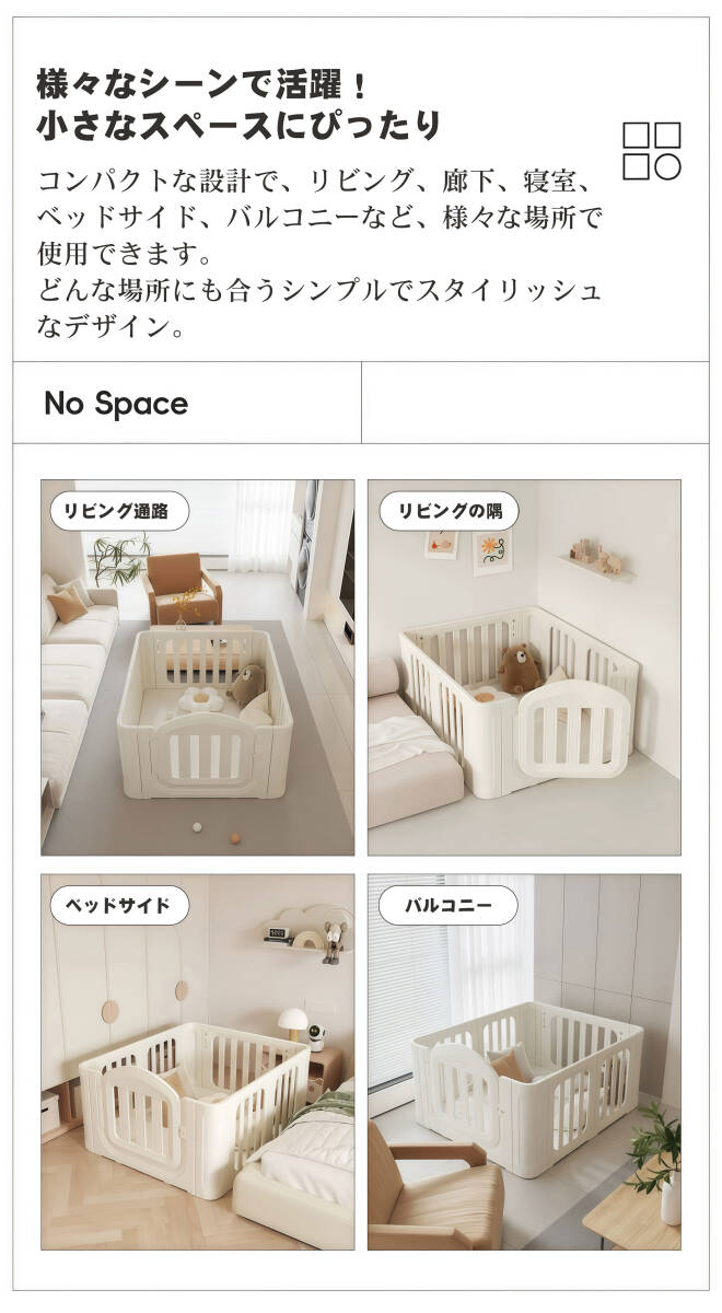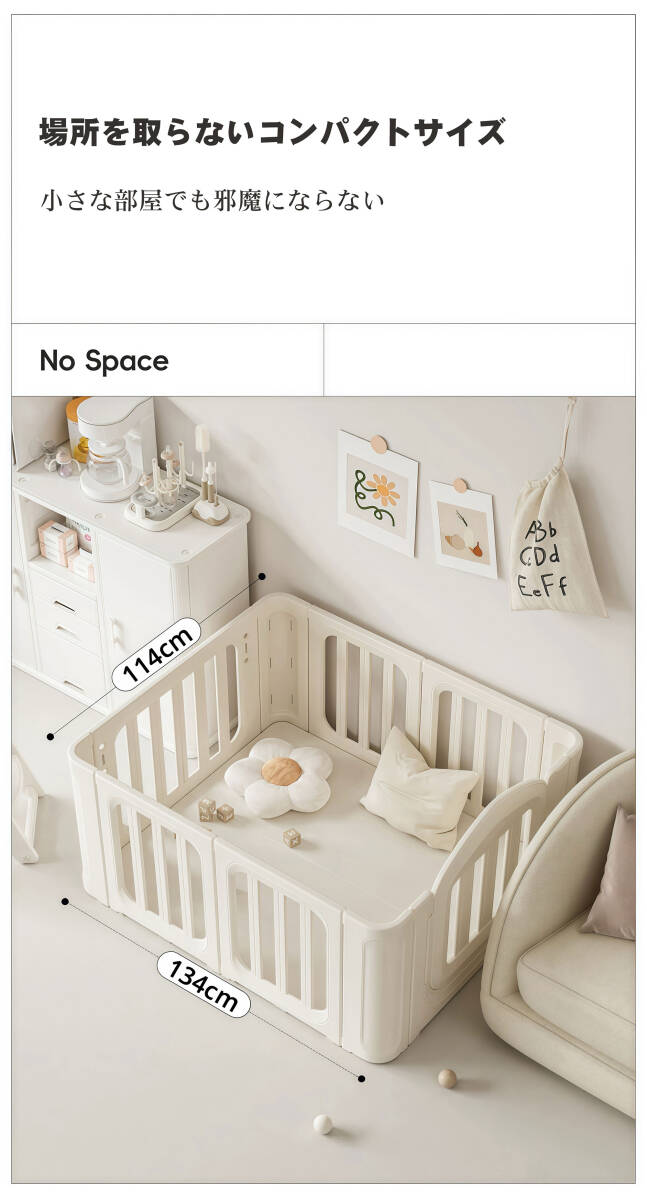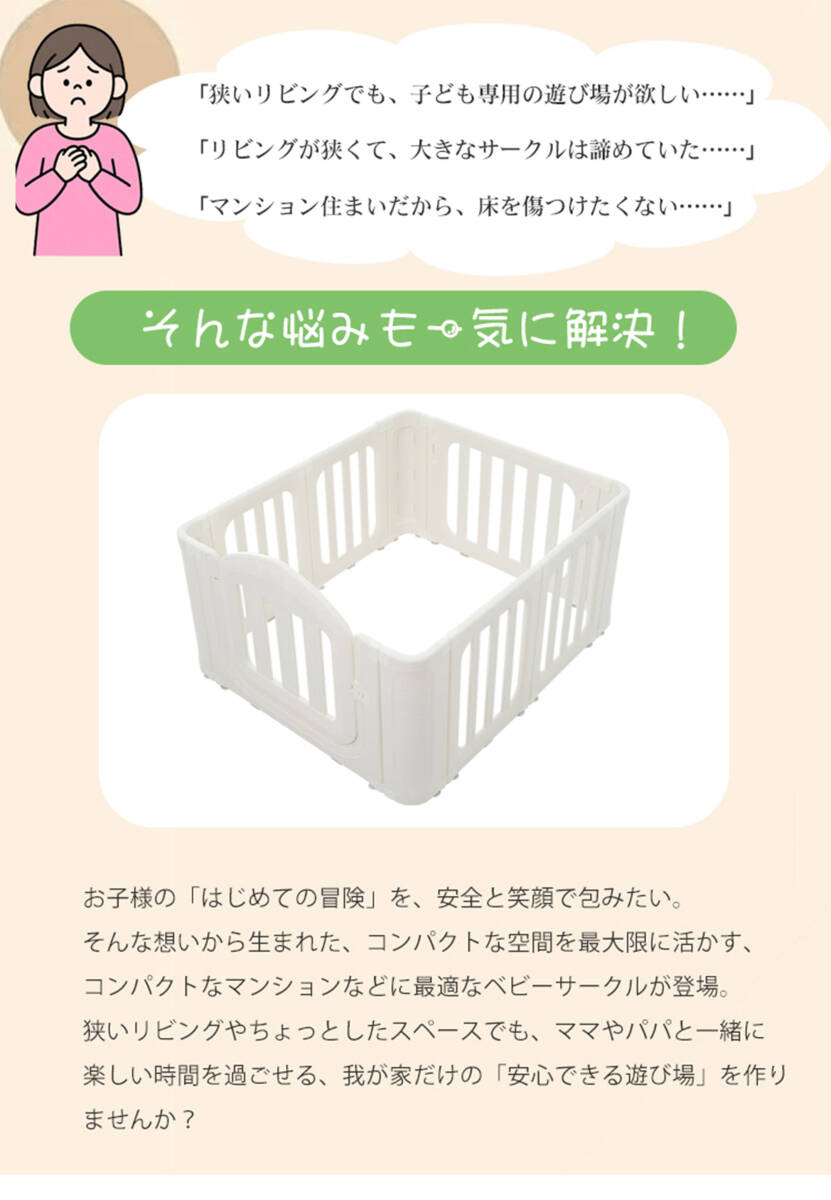 • 「狭いリビングでも、子ども専用の遊び場が欲しい……」「リビングが狭くて、大きなサークルは諦めていた……」「マンション住まいだから、床を傷つけたくない……」そんな悩みも一気に解決!お子様の「はじめての冒険」を、安全と笑顔で包みたい。そんな想いから生まれた、コンパクトな空間を最大限に活かす、コンパクトなマンションなどに最適なベビーサークルが登場。狭いリビングやちょっとしたスペースでも、ママやパパと一緒に楽しい時間を過ごせる、我が家だけの「安心できる遊び場」を作りませんか?