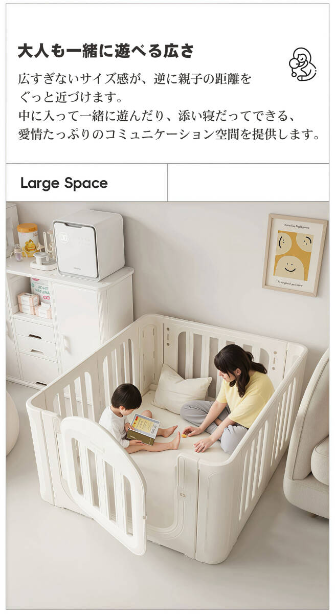 • 【大人も一緒に遊べる広さ】広すぎないサイズ感が、逆に親子の距離をぐっと近づけます。中に入って一緒に遊んだり、添い寝だってできる、愛情たっぷりのコミュニケーション空間を提供します。