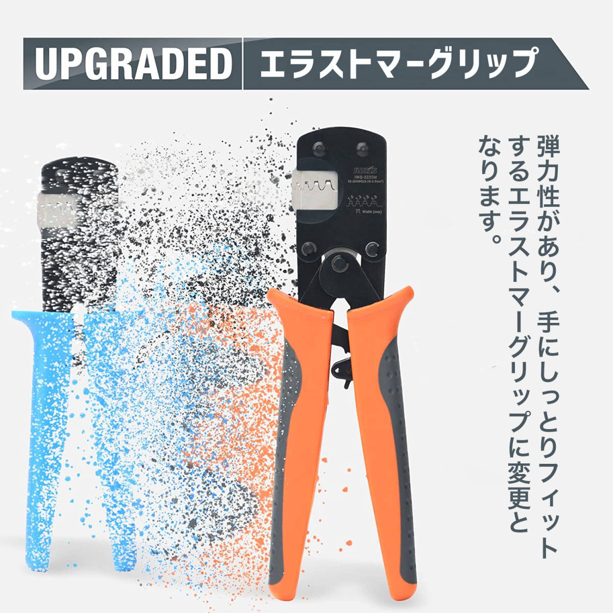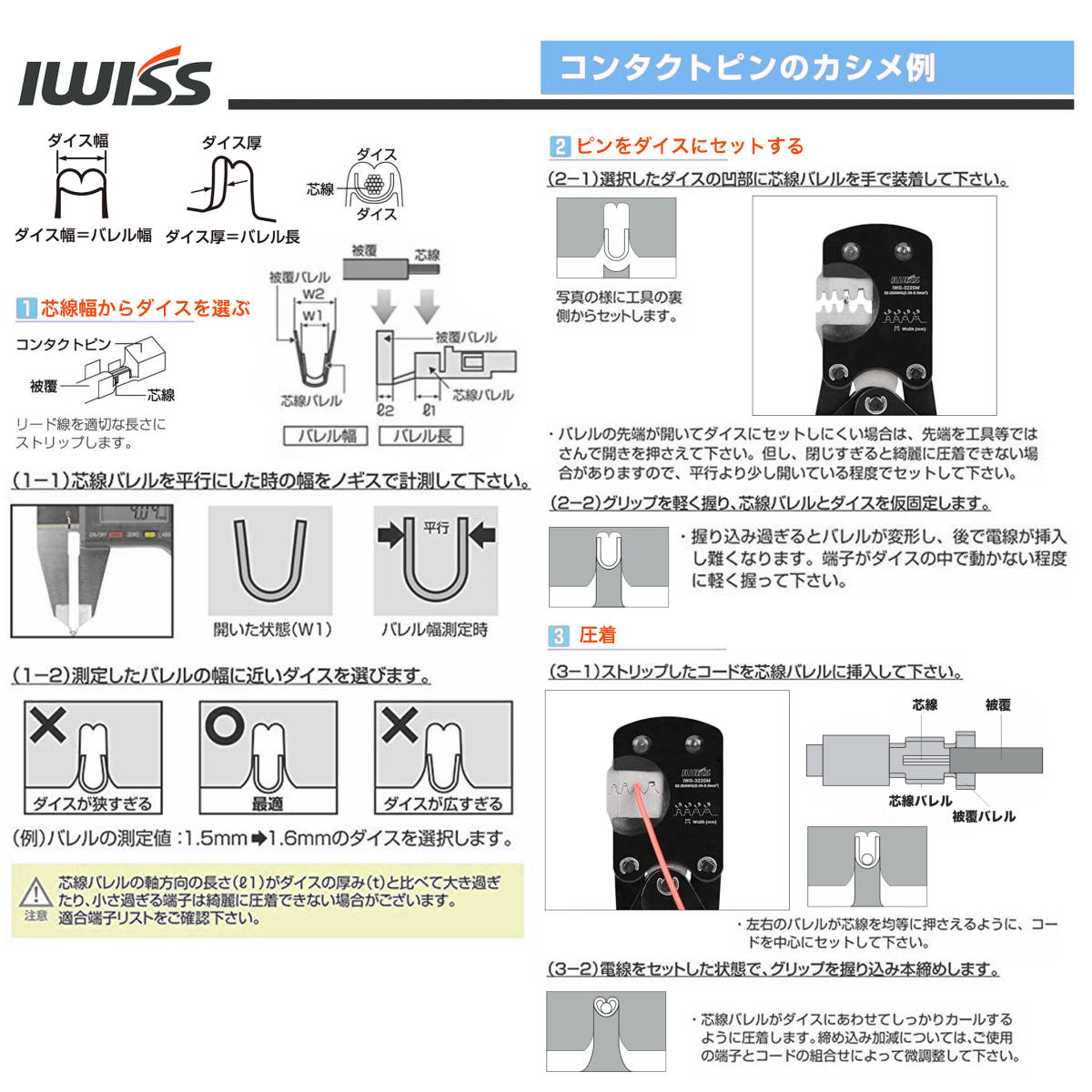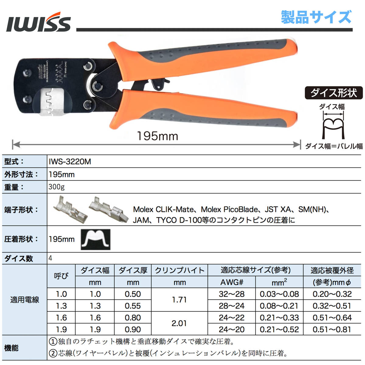 アイウィス(IWISS) JSTコネクタ用圧着ペンチ ラチェット式 オープンバレル 0.03-0.5mm2 極小端子対応 IWS-3220M JST XH、PH等のパレル幅が1.0mm~1.8mmの極小型のオープンパレル端子用圧着工具、小型ピンの圧着ペンチとして米国ベストセラーに輝いた商品です。 芯線(ワイヤーバレル)と被覆(インシュレーションバレル)を同時に圧着するIWS-3220シリーズになります。 垂直移動ダイスでで垂直にカシメるので、従来のワニ口式と比べ約70%の力で圧着できる上に確実に安定した圧着を実現。 圧着能力:AWG32-20 (0.2-2.0mm^2) 商品長さ:195mm 重量:300g 用途:芯線と被覆の同時圧着 参考対応可能な端子:Molex CLIK-Mate、Molex PicoBlade、JST XA、SM(NH)、 JAM、TYCO D-100等の極小型のコンタクトピンの圧着に等の圧着作業に。 対応可能なコネクター(弊社独自検証) ・JST XH(SXH-002T-P0.6) PA(SPHD-001T-P0.5、SPHD-002T-P0.5) EL※▲(SLM-01T-P1.3E、SLF-01T-P1.3E) ZH(SZH-002T-P0.5、SZH-003T-P0.5) EH(SEH-001T-P0.6L) PH(SPH-002T-P0.5L) ・MOLEX PicoBlade(50058-8100、50011-8100) Mini-Fit(5556TL、5558TL) CLIK-Mate 502381-0000 ・JAM 710112-2MAC ・Universal Mate-in-Lok 170363、170365 ・ダイナミックD-1コンタクト (M・L) 1903116、1827587、1903117、1827588 ・ダイナミックD-2コンタクト (S) 1318112、1318108 ※正しい圧着要領については各端子メーカーの仕様書に従って行って下さい。 検証結果については圧着の可否を保証するものではありませんので予めご了承下さい。 ※メーカー様は一切関係ありません。 ※本件について端子メーカーへのお問い合わせも一切ご遠慮下さい。 IWISS アイウィス「IWISS」はプライヤやペンチを主力とした工具類が販売され、ドイツやアメリカをはじめ、世界50か国以上で販売されているの人気ブランドです。 発売されたオープンバレル用圧着ペンチやワイヤペンチがEUやアメリカのECサイトでベストセラーランキングで何度も1位になっている大ヒット商品です。高品質な材料から作られたそれらの製品はその精度と実績から高い信頼を得ています。 | |||