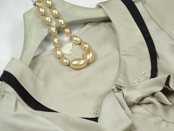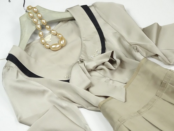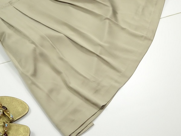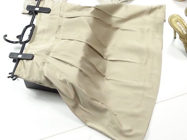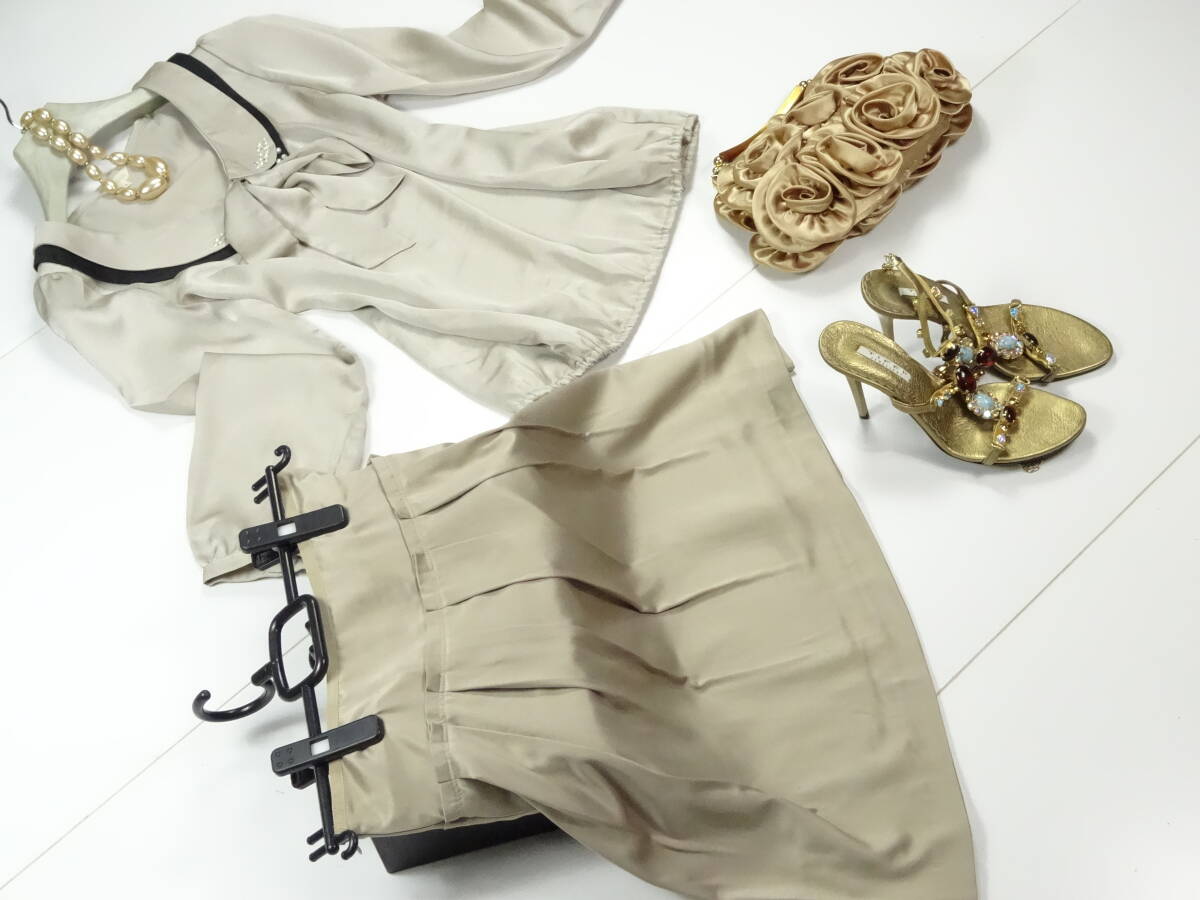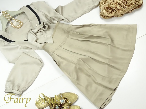 ブラウスは光沢のあるゴ-ルドサテンで襟にはパ-ルとビジュ-が施され大変エレガントです。スカートは同じくゴ-ルドでフレア-仕立てで上品な女性を表現。パーティやイベント、コンサート、結婚式にと、さまざまシーンで活躍してくれる美しい一着。(スカ-ト)裏地付。ファスナ-有。