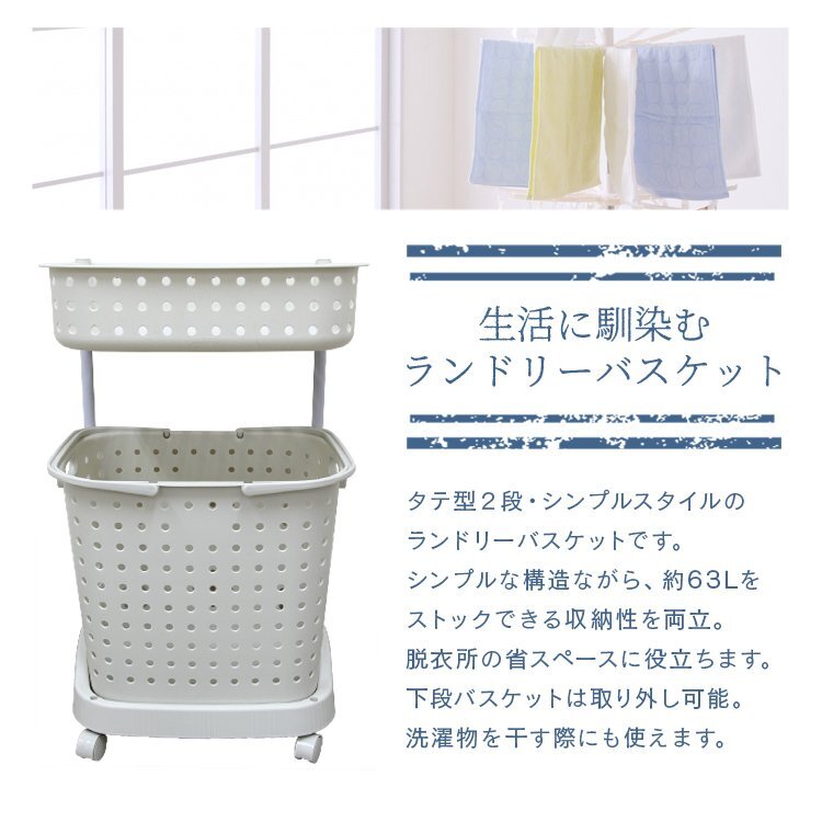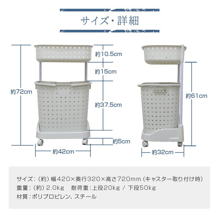 | サニタリースペースをすっきり出来ます。 上段の浅バスケットにはバス用品、洗濯機まわりの小物が収納できます。 入浴時の着替えや脱衣カゴとしても重宝します。 下段のバスケットは大容量の深型タイプ!洗濯物干し場までの移動に便利なハンドル付き。 移動に便利なキャスター付きです。 【商品仕様】 カラー:ホワイト サイズ(約):幅420×奥行320×高さ720mm(キャスター取り付け時) 重量(約):2kg 容量(約):63L 材質:ポリプロピレン、スチール 組立式 |