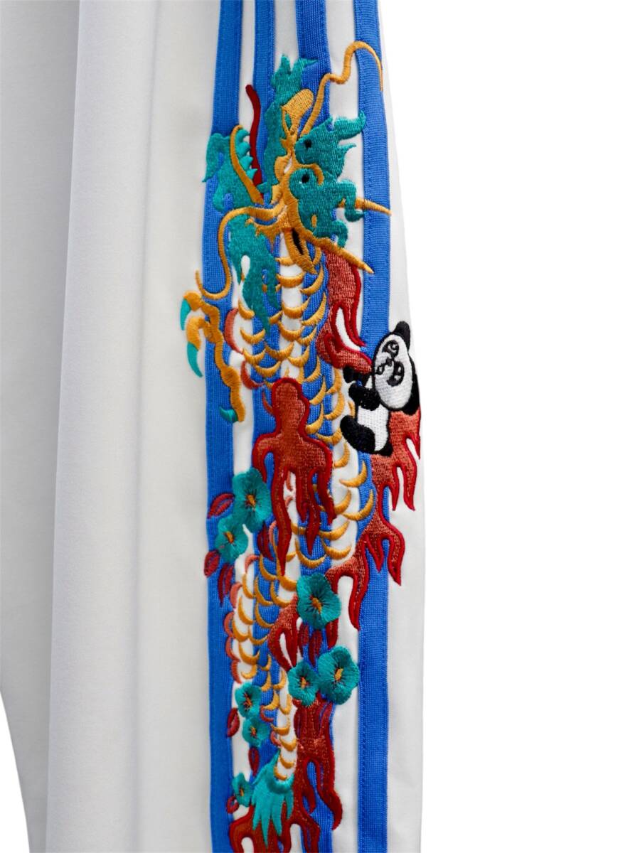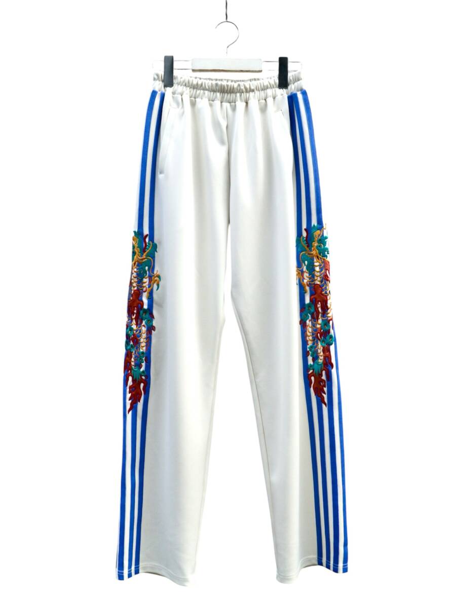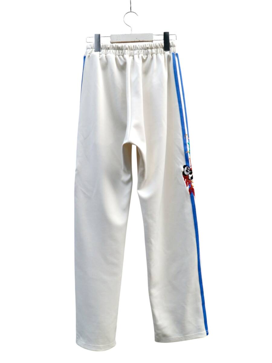 4本ラインの上にPEPE & DRAGONの刺繍を施したトラックパンツ。