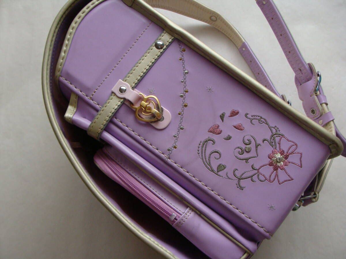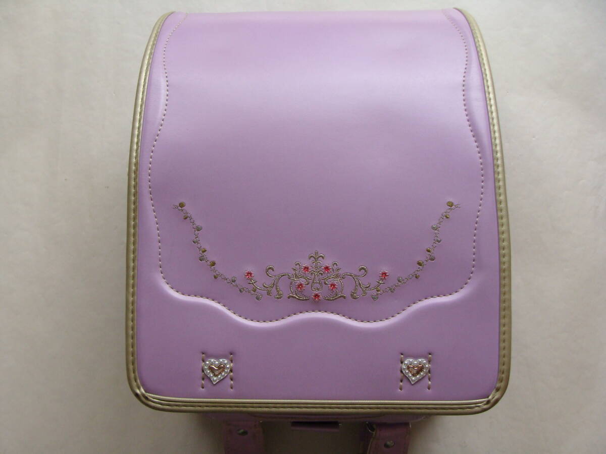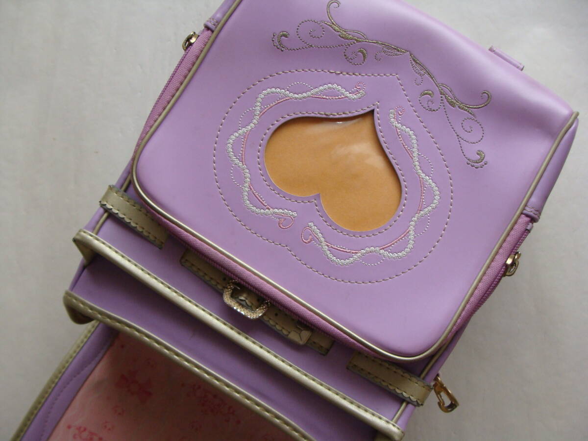 現状お渡し 中古ランドセル(紫色 × ゴールド)美品 日本製 ハート&リボンモチーフ 大きなダメージなし