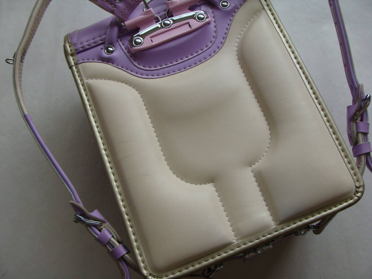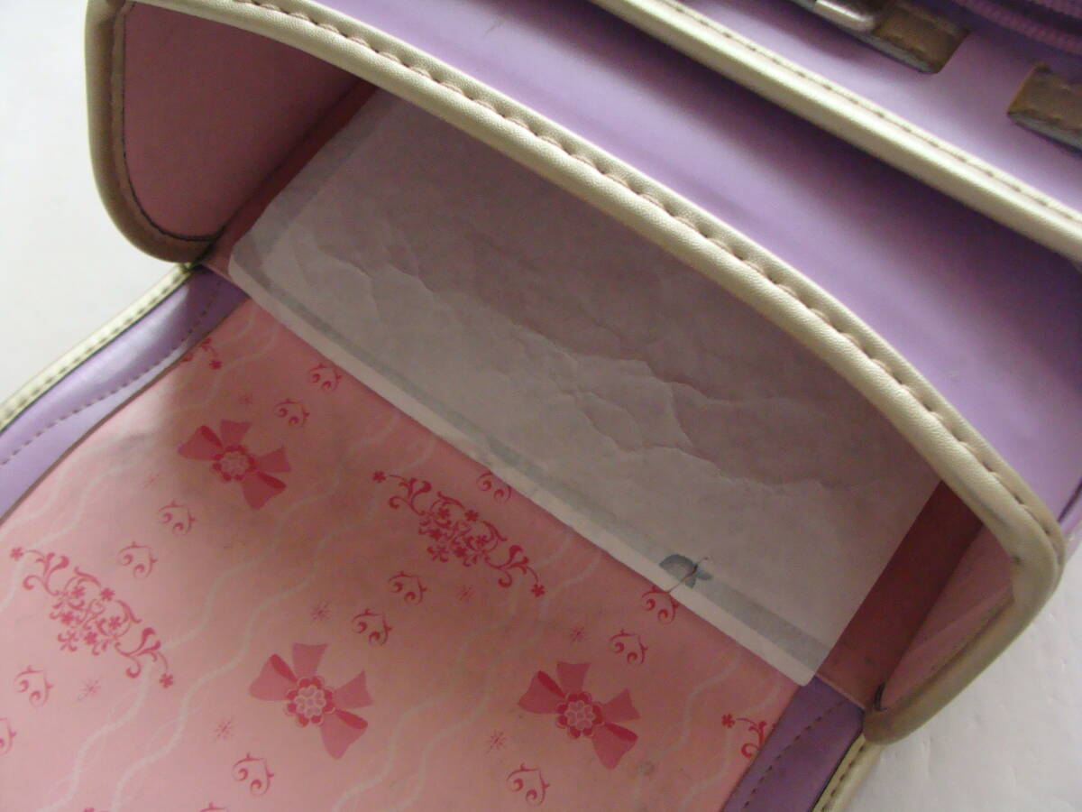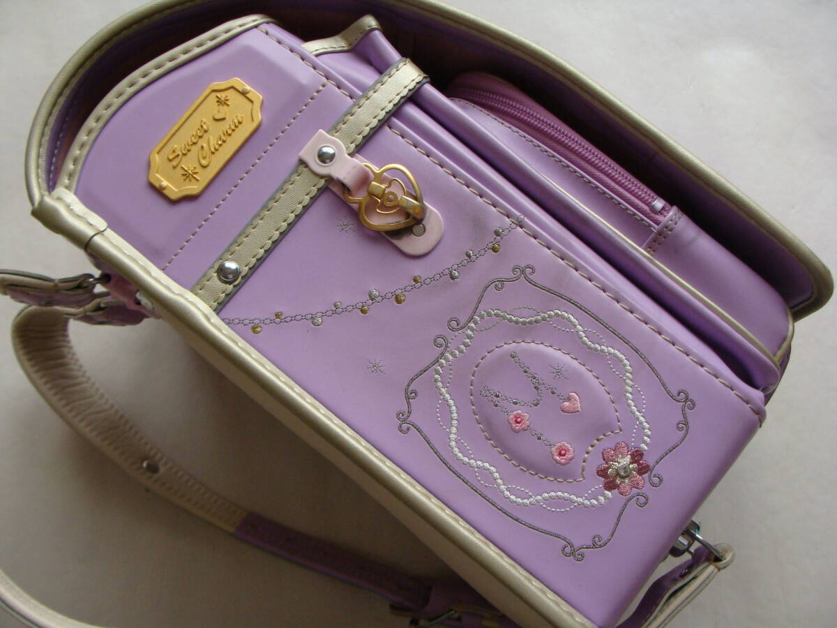 現状お渡し 中古ランドセル(紫色 × ゴールド)美品 日本製 ハート&リボンモチーフ 大きなダメージなし