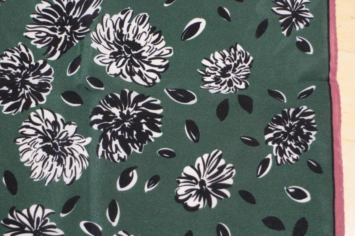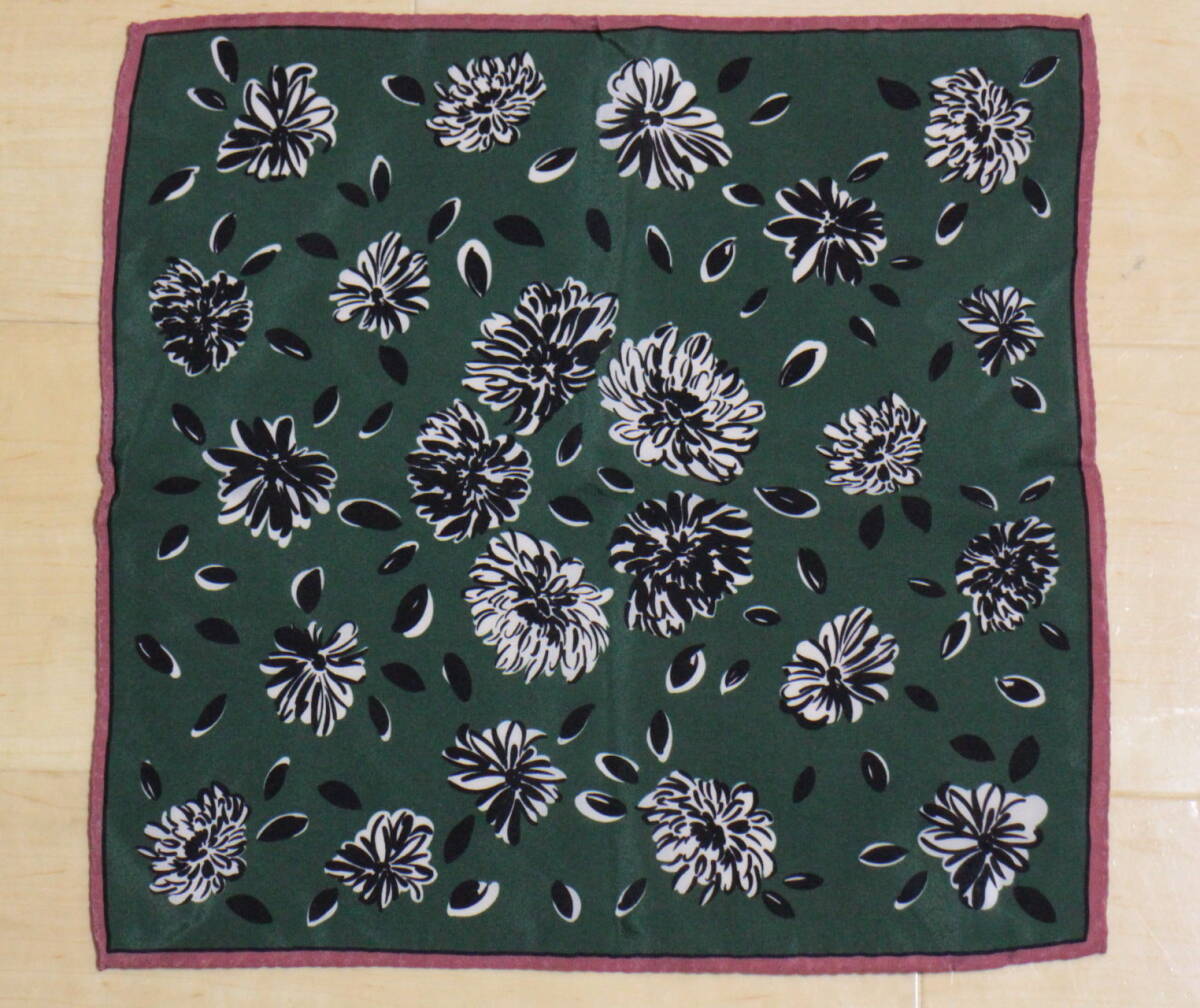 ニッキー*ストラスブルゴ新品ポケットチーフ超モダン華麗サファリグリーン*フィッシャーピンクモノトーンダリア柄ハンドメイド