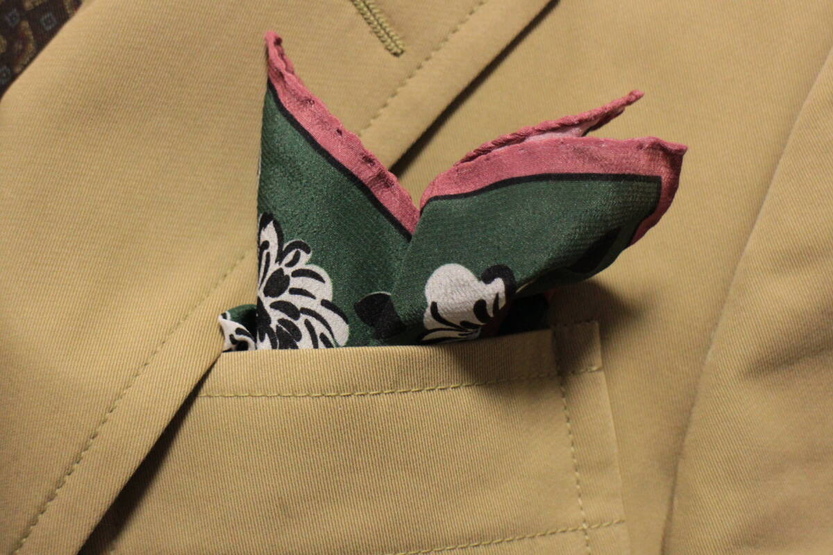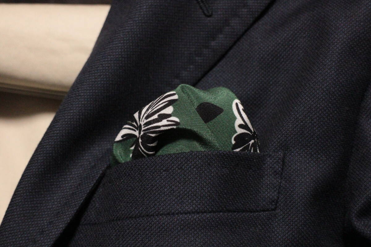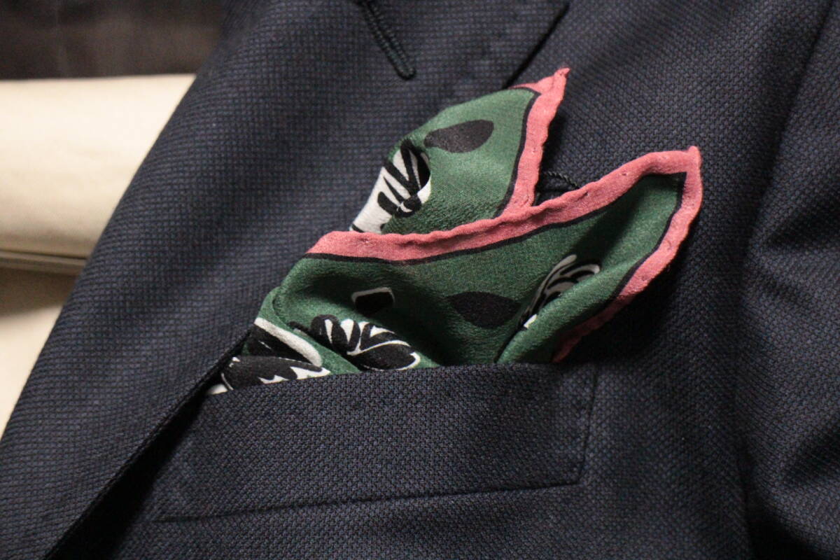 ヘムの仕上げも、ハンドロールの極細三巻仕上げで、ポケットに挿した時もふっくらとして、