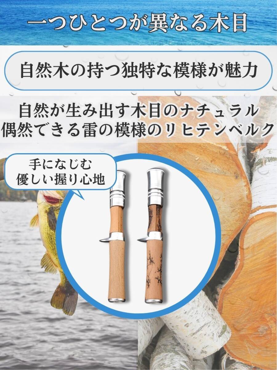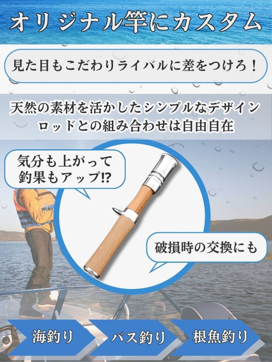 オリジナルロッドの自作や破損時の補修・修理・交換パーツとして、またベイトロッド用木製ウッドグリップとして様々なシーンで活躍します。自作竿のメンテ入れ替え、カスタムドレスアップや補修用パーツとしてアレンジは自由自在です。グリップを差し換えるだけで全く違う印象に変えることができるので、気分を変えて楽しむことができます。※ロッドのサイズが合えば簡単に取付が可能です。