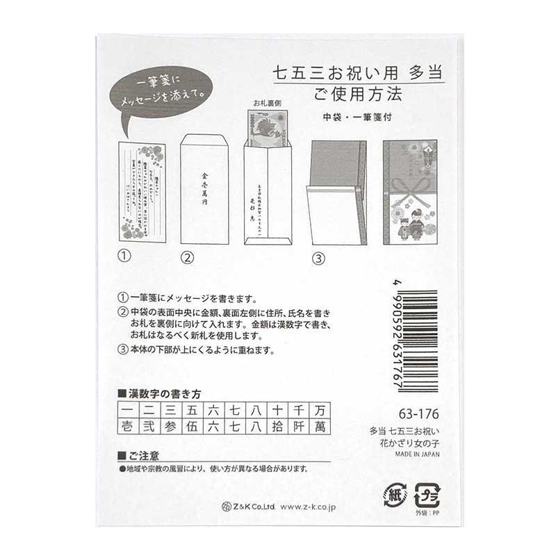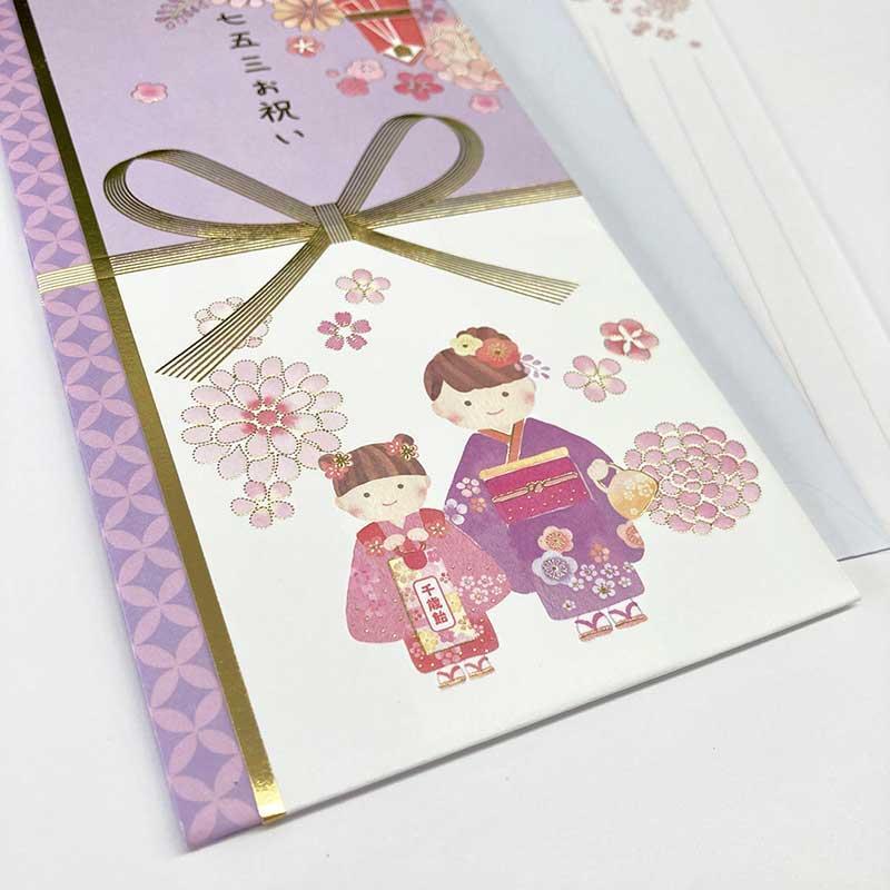 【即決】★七五三お祝い のし袋★ Z&K 中袋 一筆箋付 パープル 金封 御祝儀袋 多当 金箔押し 花柄 女の子用 着物 千歳飴 // 63-176