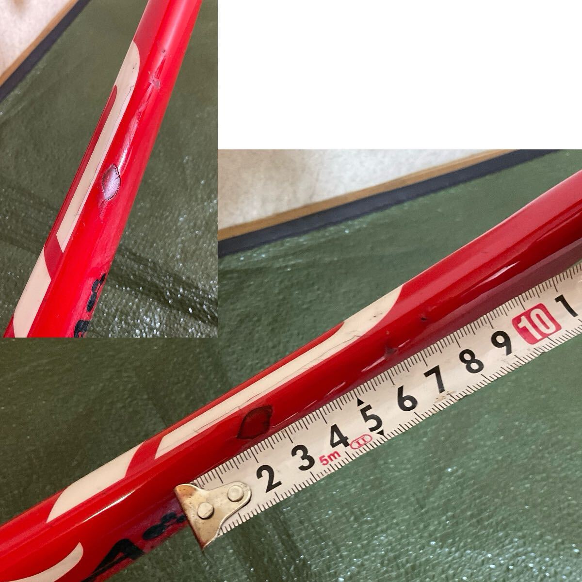 フレーム後方、チェーンステイ部分に凹キズ箇所とその横に、深くまでいっていませんが7cm程の浅い線ヒビがある箇所があります。(写真7)