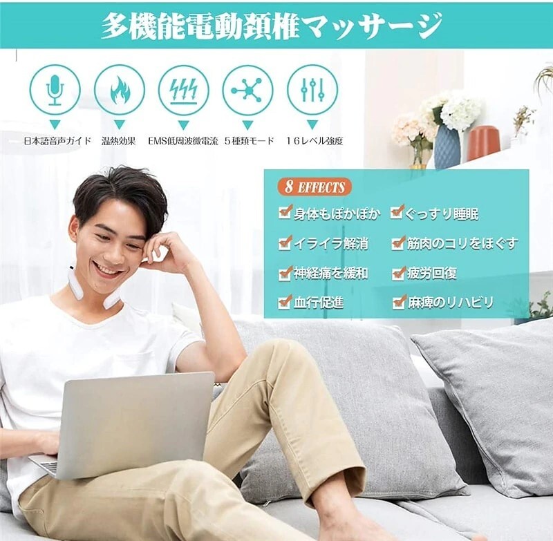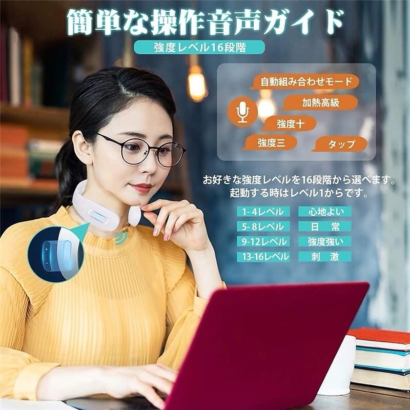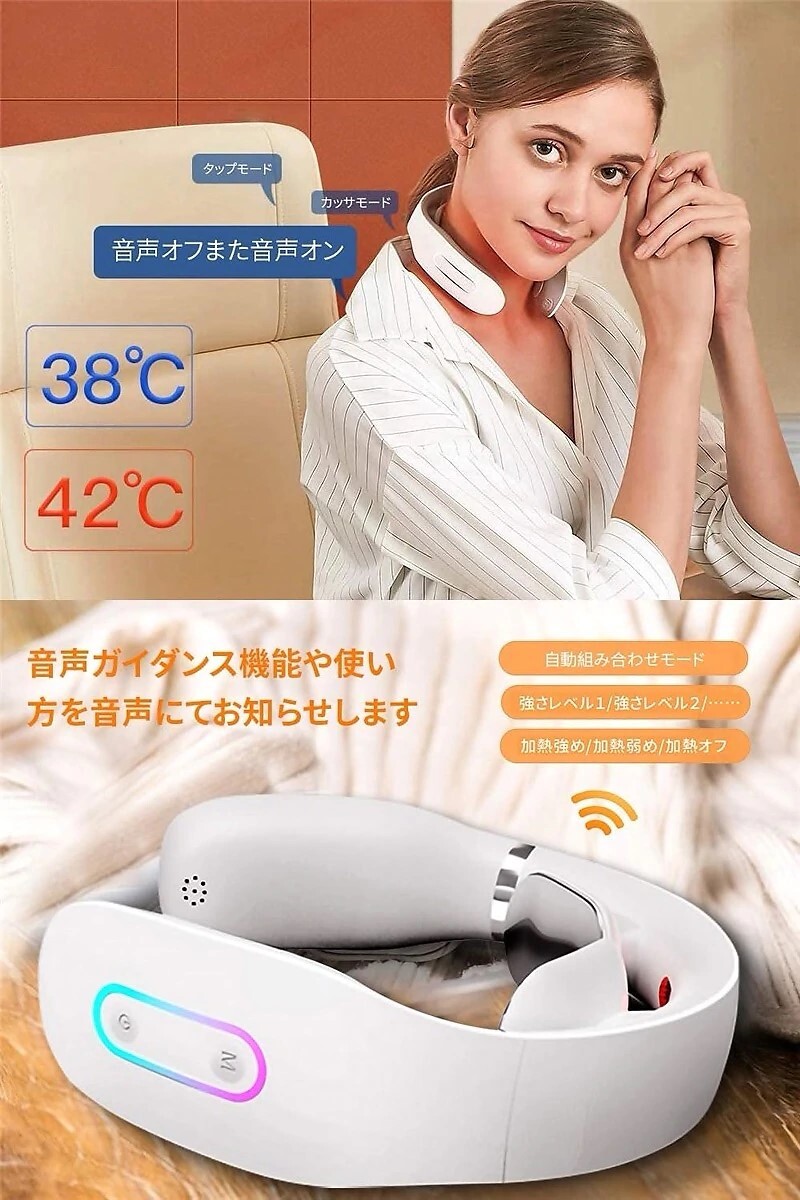 【2段階温熱調節&遠赤外線&EMS】表層の筋肉から奥深くまで、EMSが優しく刺激するので、気持ちよくリラックスできます。 赤外線加熱機能で、加熱モードも自由に調整できますので、心地良い温度に調整できます。 血液の循環を促進し、頚部の硬直や疲労を緩和します。 頚部の筋肉を奥深くからリラックスさせてくれます。