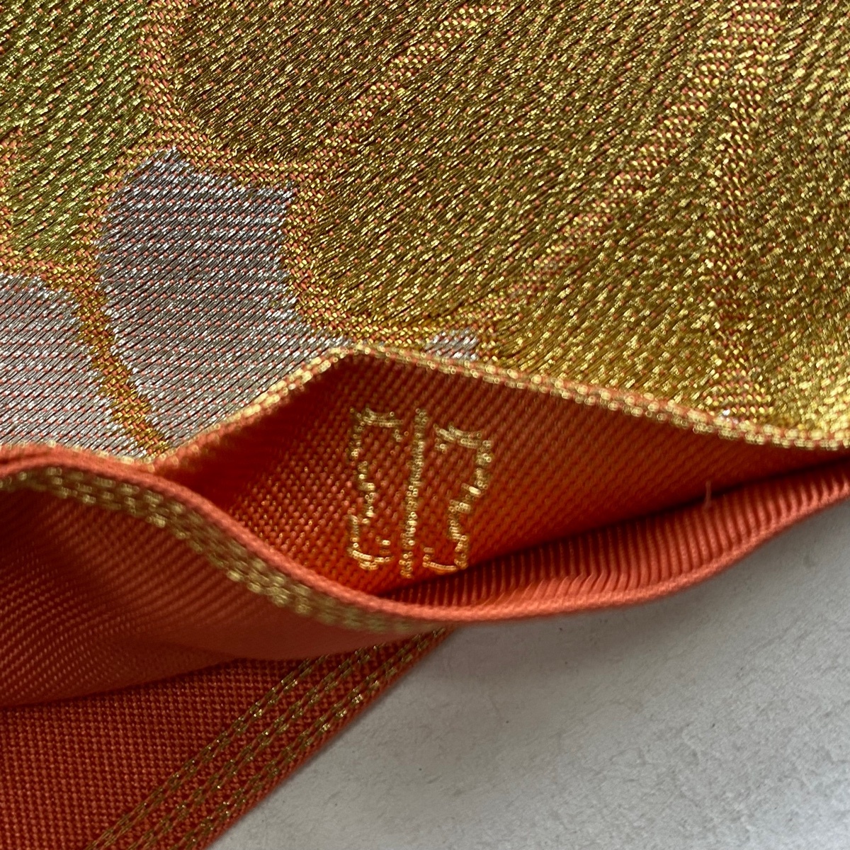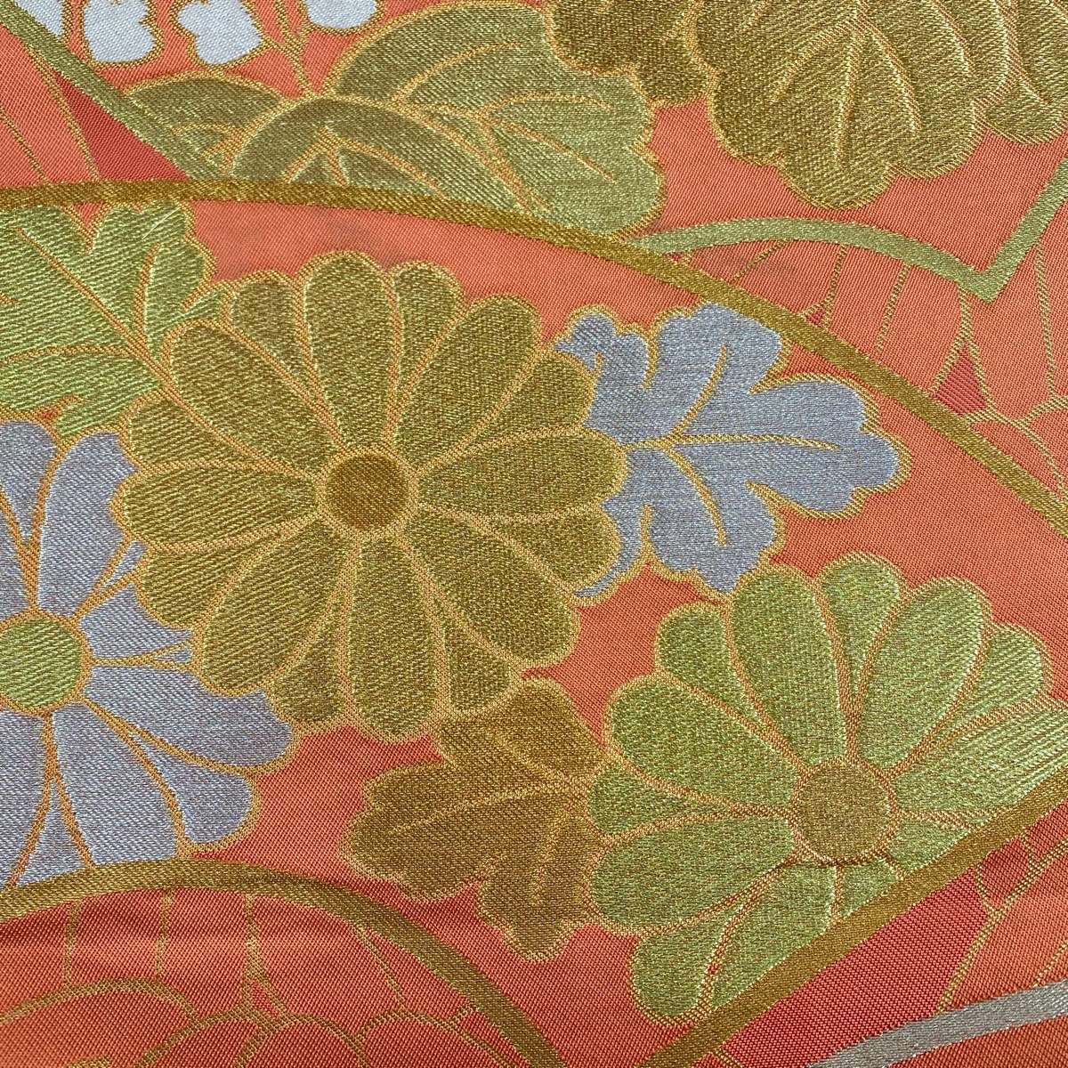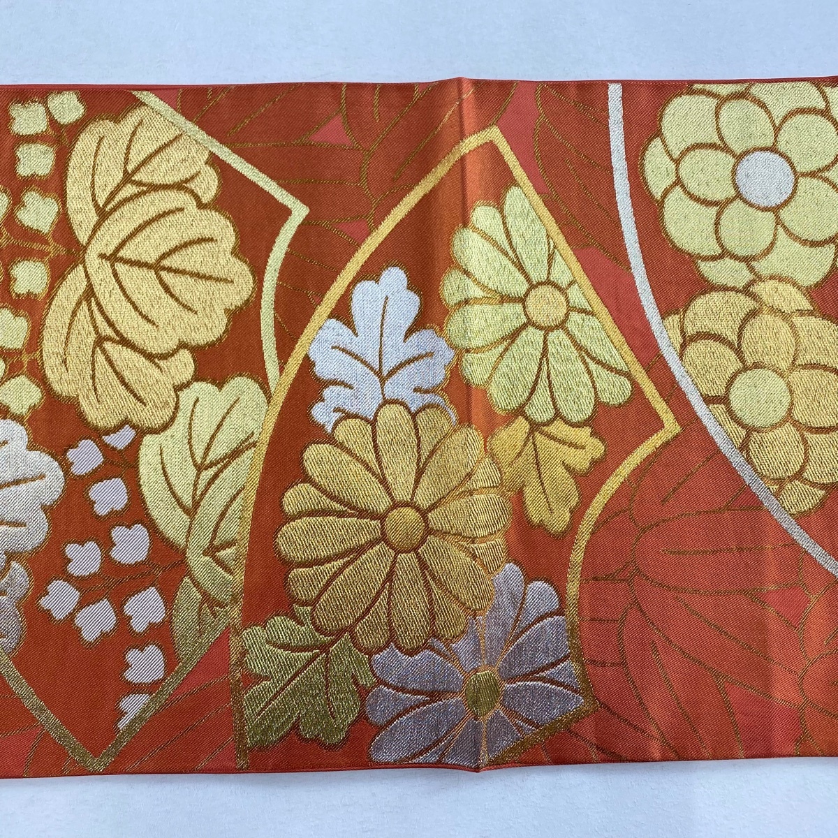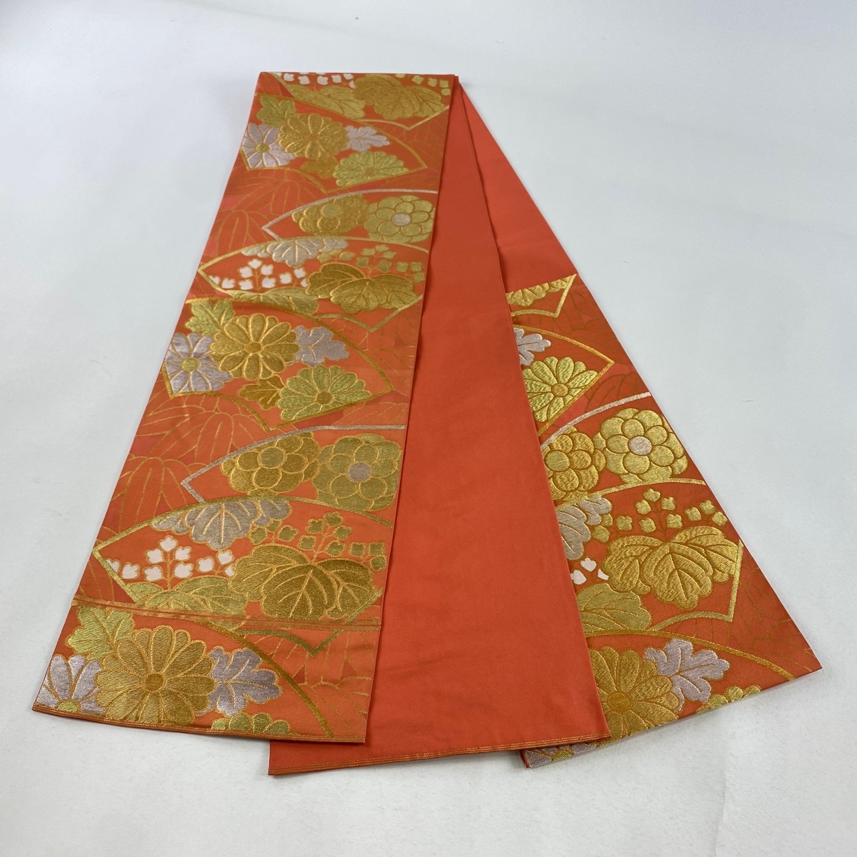 | 袋帯 秀品 川島織物 落款 関西仕立て 扇面 菊 金糸 オレンジ 六通 正絹 【中古】 |