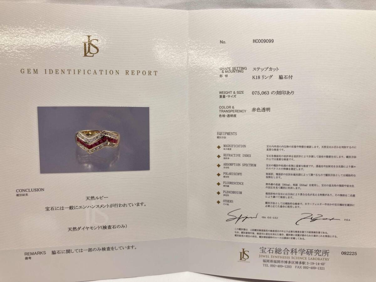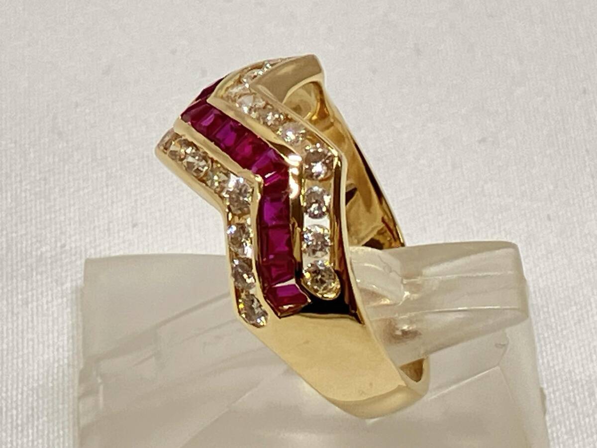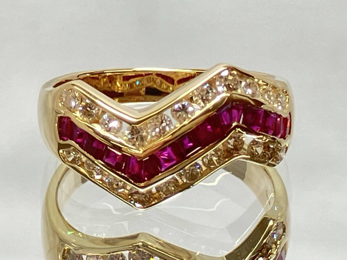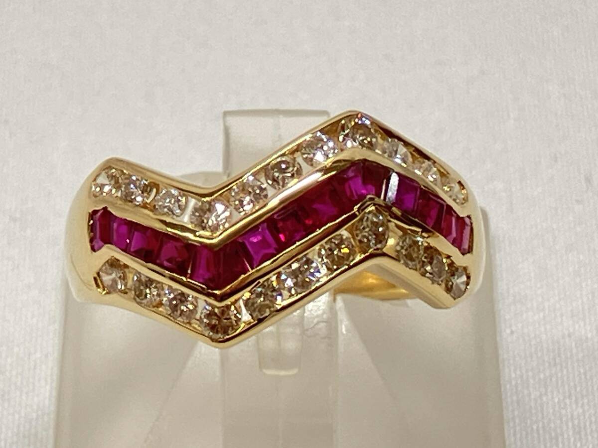 画像のものがすべてです。 素材:K18 品名:リング 宝石名:ルビー、ダイヤモンド カラット:0.75ct、0.63ct リングサイズ:約15号 リング幅:約3.1〜7.6mm 総重量:約5.0g リングサイズは変更できかねますのでご了承ください。 ※サイズはスタッフが手作業だ計測しており、誤差が生じることがございます。予めご了承ください。 ※当店の殆どの商品は中古のお品物でございます。その為、中古品の時点で小傷はあるものとご理解の上お買い求めください。 | ||||||