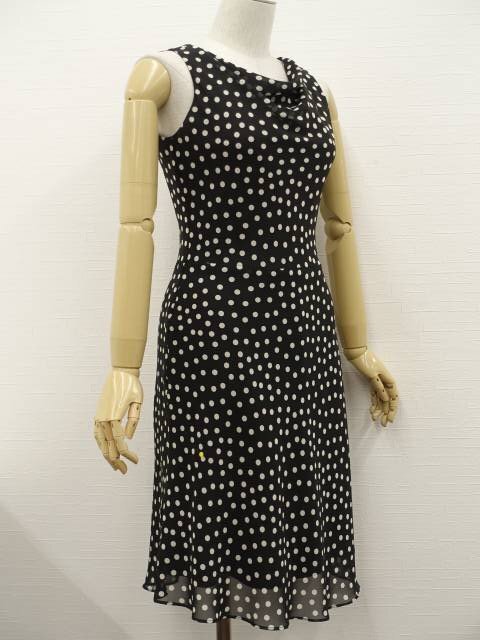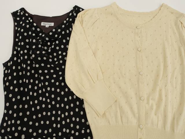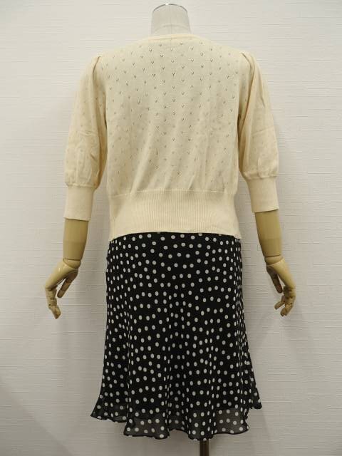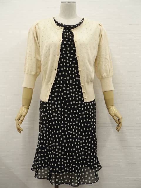 七分袖ニットカーディガン+ロング丈シフォンノースリーブワンピース コーディネート2点セット M相当 クリーム/ブラック×ホワイト ドット柄 シンプル系 20代・30代~