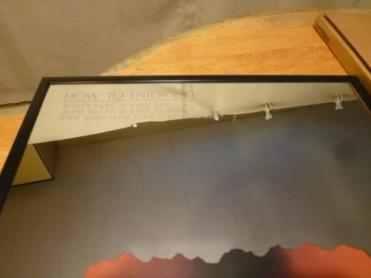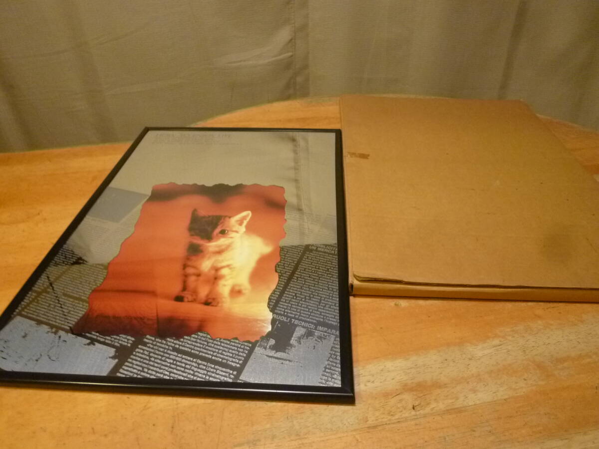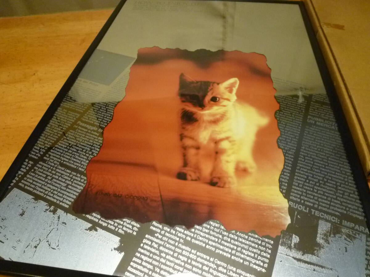 こちらは写真立て?入りミラーの様です。全体の1/3上がミラーで、その下は英字の細かな文字で斜めに埋め尽くされ、その中心部が写真立てになったものです。子猫の写真は裏から取り出せ、その部分にお気に入りをセット出来、何時もミラー使用と共に心休まると思います。