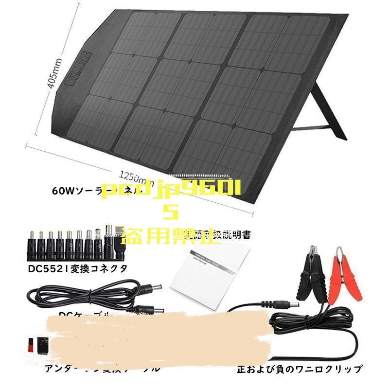 商品状態:新品未使用 カラー:ブラック 展開サイズ:1250*405*5mm 収納サイズ:405*350*40mm 商品重量:2.55 kg 梱包サイズ:430*290*400mm; 2.8 kg 材質: PET単結晶156 電源:太陽光発電 電圧:18V 電流:3.33A 開回路電圧:21V 短絡電流:3.67A 操作温度:-40°C to 70°C 出力ポート:DC5.5*2.1、USB パッケージ内容:60Wソーラーパネル、DCケーブル、DC5521変換コネクタ、1xアンダーソン変換ケーブル、1x正および負のワニ口クリップ、1x英語取扱説明書 ★商品写真はできる限り実物の色に近づけるよう努めておりますがご使用のPCモニター設定や部屋の照明により多少、色の変化が感じられる場合がございます