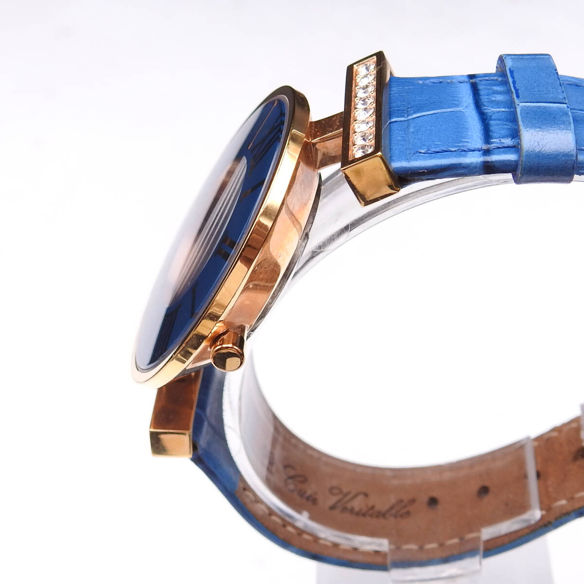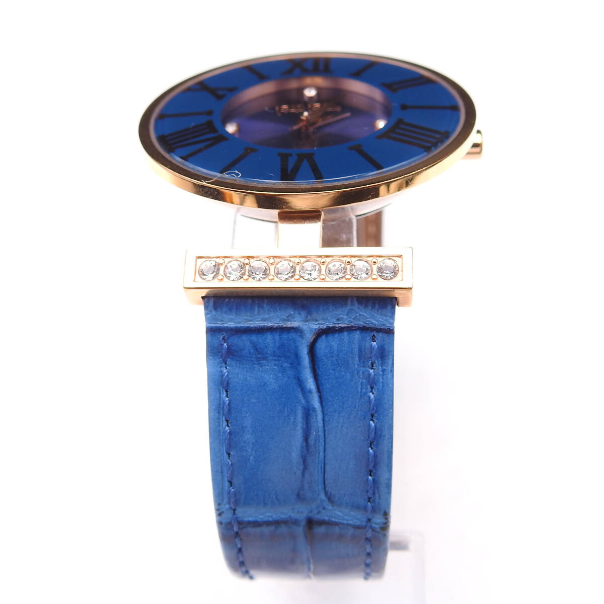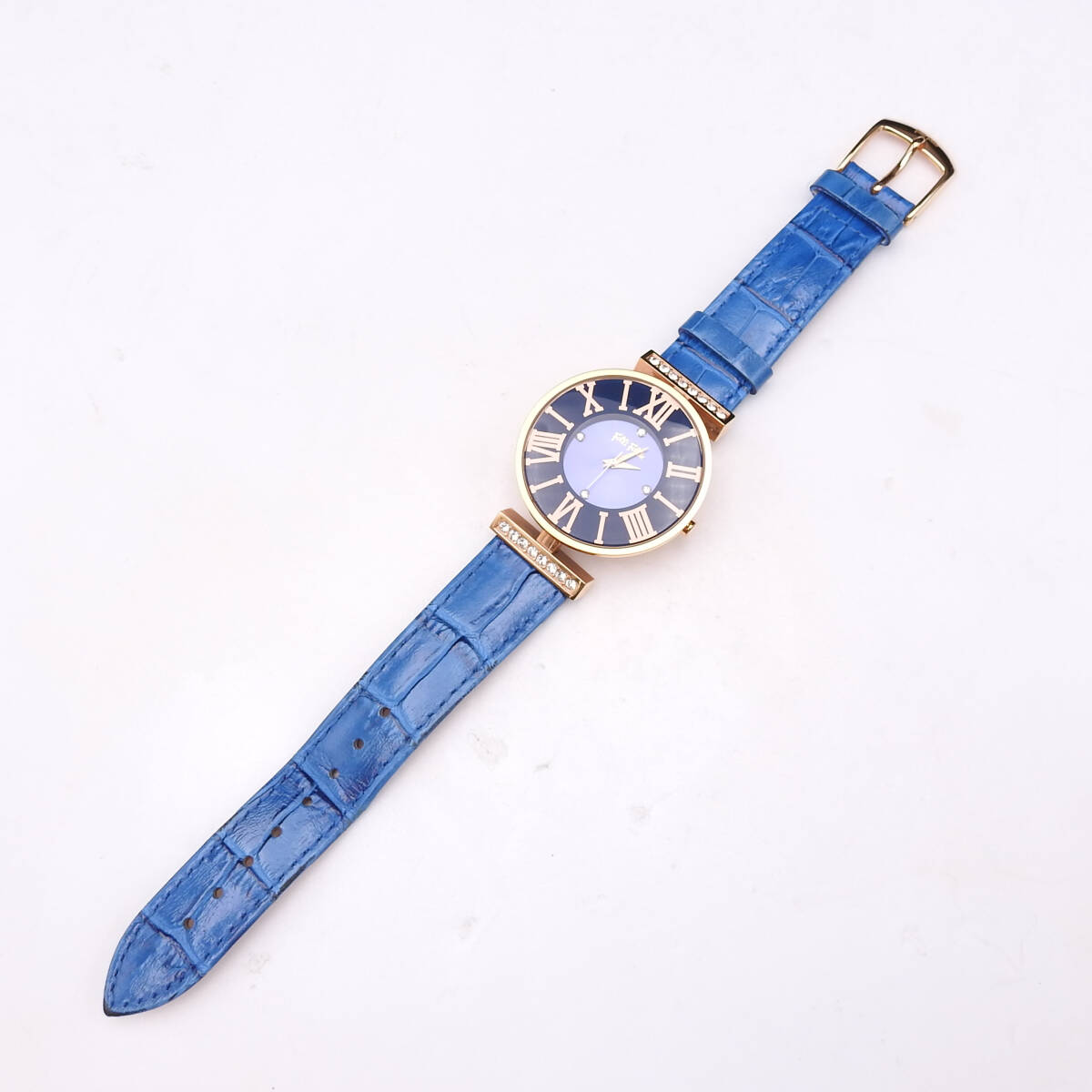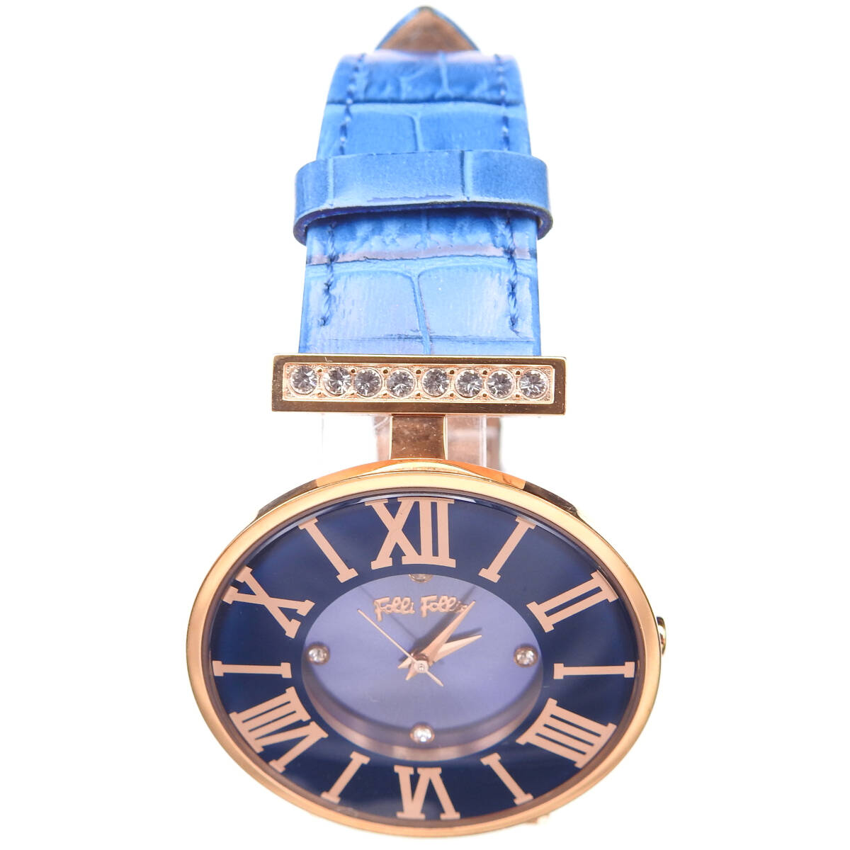 【稼働確認済】Folli Follie【フォリフォリ】 腕時計 クオーツ ゴールド ブルーベルト 青文字盤 SS/革 ラインストーン
