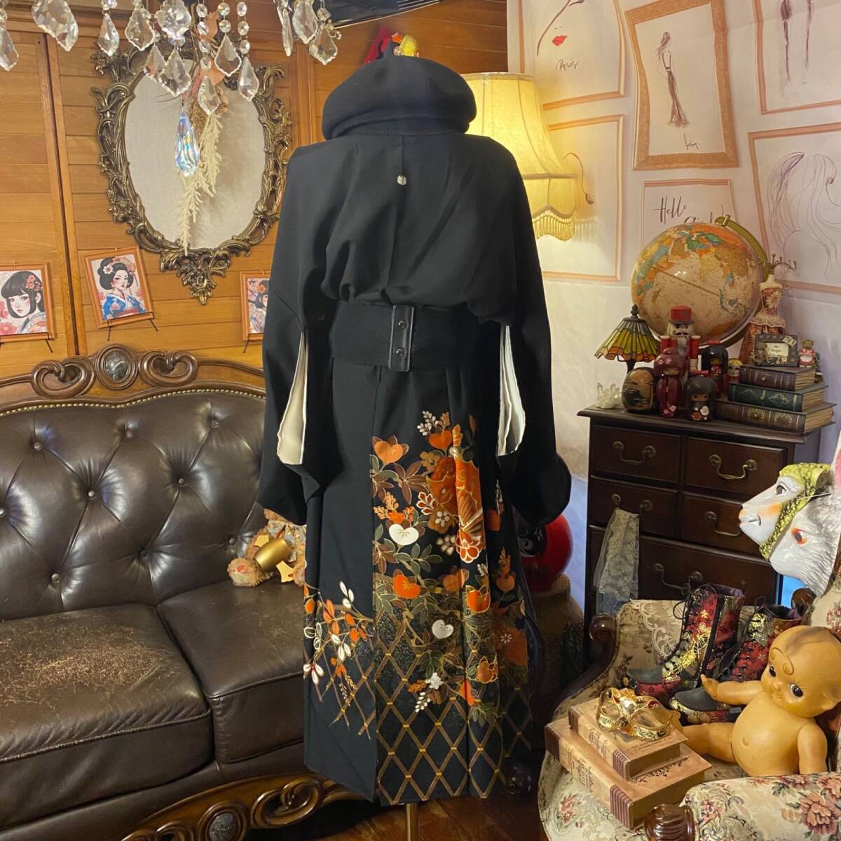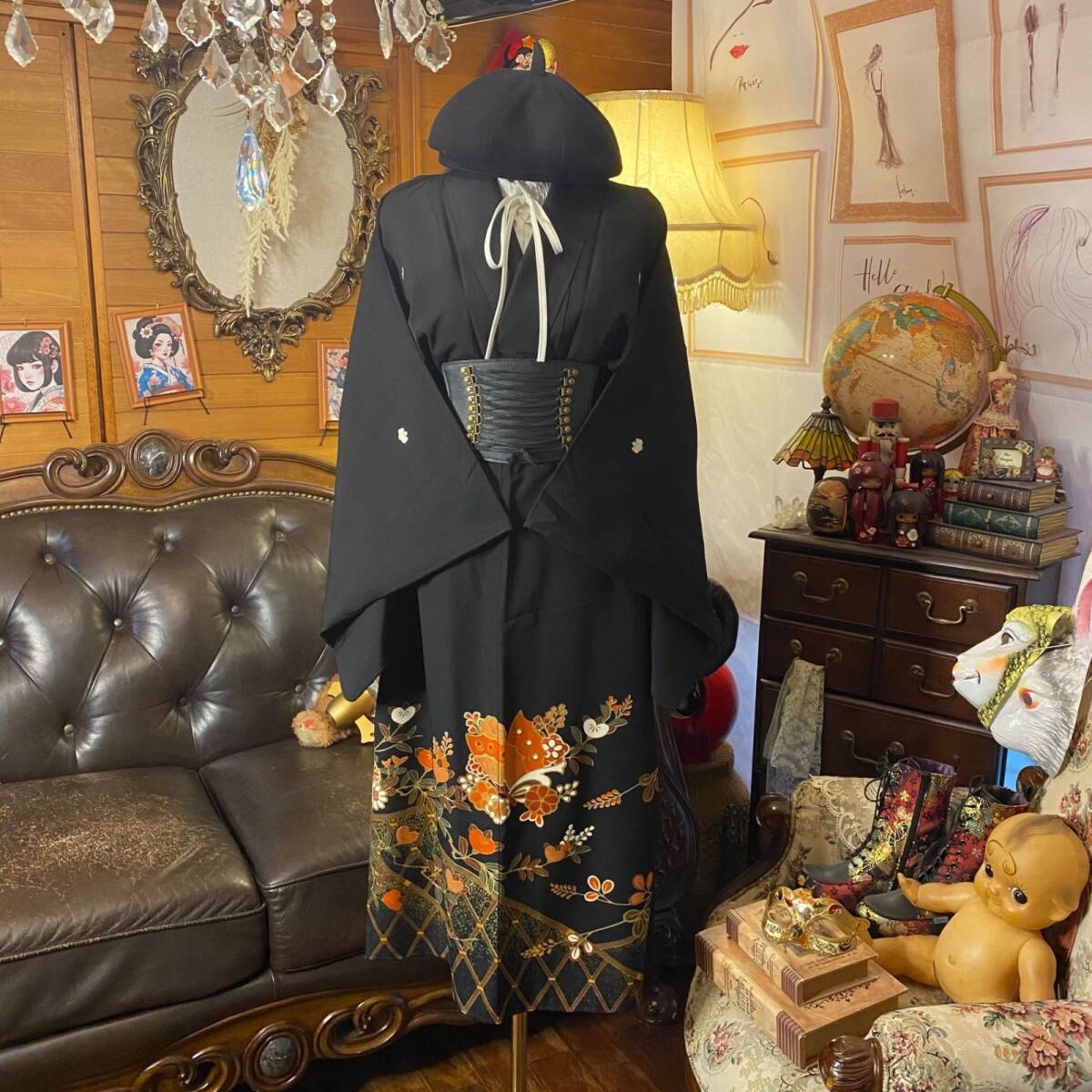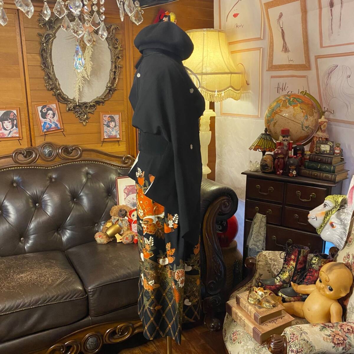 格式美とレトロモードが共鳴する、存在感抜群の黒留袖リメイクワンピースセットです。