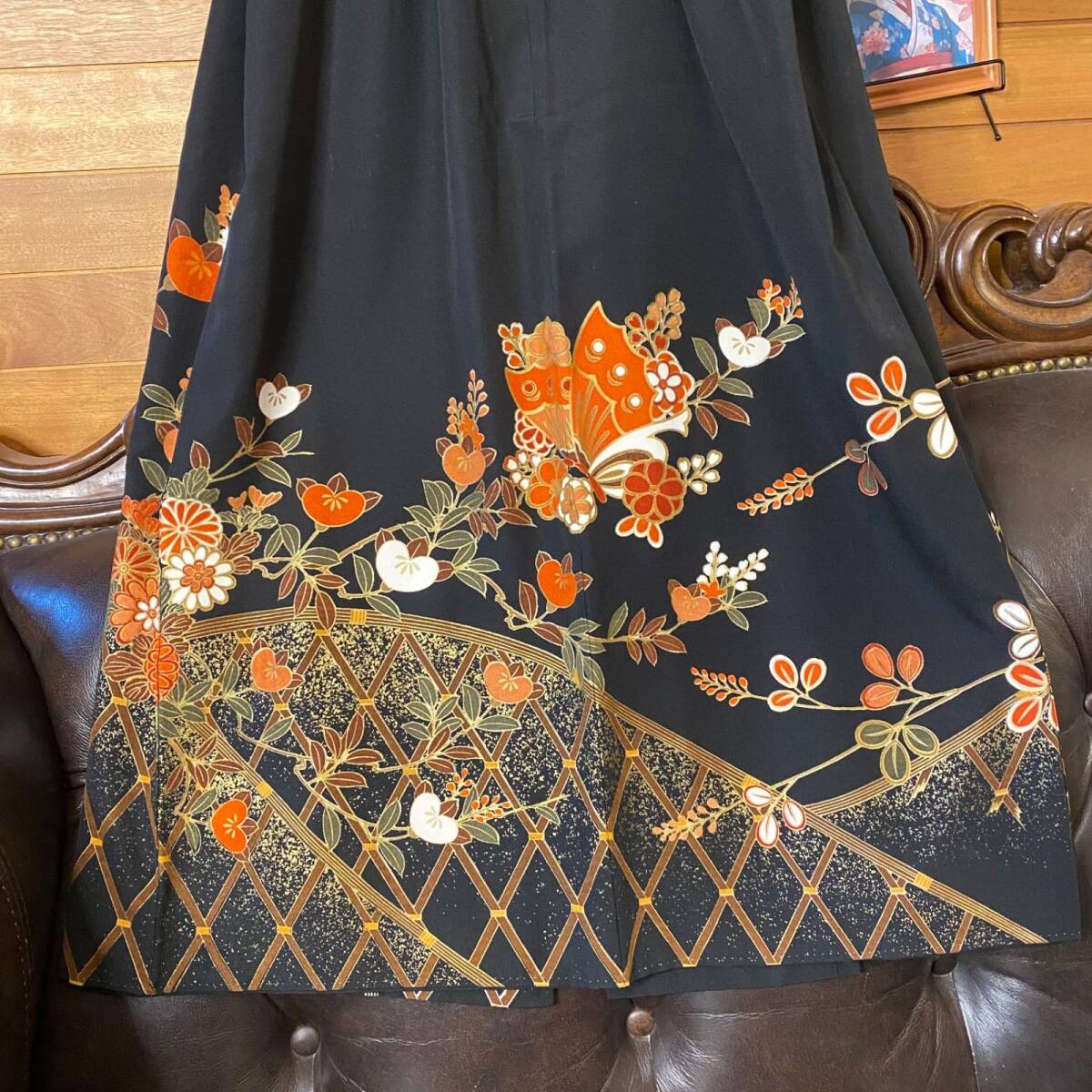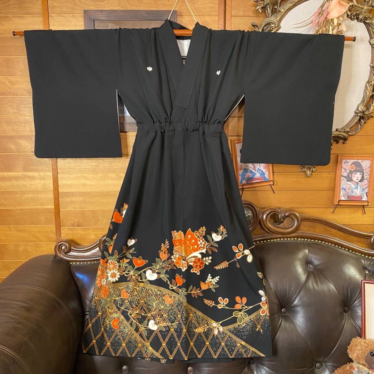 【 和洋折衷 黒留袖 着物 リメイク セミロング ワンピース ドレス 洗える 化繊 ハンドメイド レトロ 古着 金彩の菱格子×砂子が流れ TKW-72】