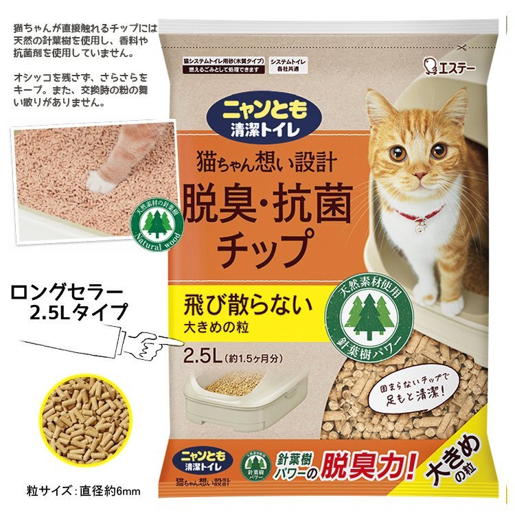 商品説明 | 猫ちゃん想い設計。猫ちゃんの快適も、清潔も、健康も。 ●脱臭・抗菌チップ(システムトイレ用猫砂) ●固まらないチップで、足もと清潔。 ●オシッコを残さず、さらさらをキープ。 ●猫ちゃんが直接触れるチップには天然の針葉樹を使用し、香料や抗菌剤を使用していません。 == 粒の大きさ/目安 == ・大きめの粒 ・直径:約6mm ・肉球にはさらまず飛び散らない == 特徴 == ●ウンチとオシッコのニオイを強力消臭! 天然素材の針葉樹のチカラで、ウンチとオシッコの臭いをしっかり閉じ込めます。 ウンチをしたときも、さらさらのチップがニオイを脱臭、針葉樹の香りが長続きします。 ▽「針葉樹のチカラ」って? 針葉樹には、ニオイや菌の発生を抑える成分(総称:フィトンチッド)が含まれています。 脱臭・抗菌チップは、この針葉樹の木材が主原料!ニオイを脱臭してず~っと爽やかな香りに包まれます。 ●おそうじラクラク チップはオシッコで固まらないから、取り除く手間なし。 ■品名:ニャンとも清潔トイレ ■脱臭・抗菌チップ:大きめの粒 ■サイズ:直径/約6mm ■内容量:2.5Lx18個入 ■用途:猫システムトイレ用砂(木質タイプ) ■材質:木材、はっ水剤、脱臭剤 ■処理方法:天然素材の木材を使用しているので、燃えるゴミとして処理できます。 ※ただし、自治体により廃棄物の分類が異なる場合があるので、お住いの地域のルールに従ってください ■使用期間の目安 ・愛猫1頭の場合:2.5Lで約1.5ケ月 ・愛猫2頭の場合:2.5Lで約3週間 ※愛猫の尿量は、体重や季節、年齢等によって変化します。チップの補充量は、愛猫の数や尿量、お使いのトイレの大きさによって調整してください。 ※チップは木材を主原料にしているため、木材の産地や季節などで若干ニオイや色が変わる場合がありますが、品質上問題ありません。 ※各社のシステムトイレ用トレーでもお使いいただけます。 ※ニャンとも清潔トイレは、チップ(砂)を通過しても、尿の成分に影響を与えません。 ※仕様は予告なく変更する場合があります。実際の商品のデザイン、色、仕様が一部異なる場合がございます。 3ケース/3箱/3cs/まとめ買い/ケース買い/ケース購入/ケース販売 |