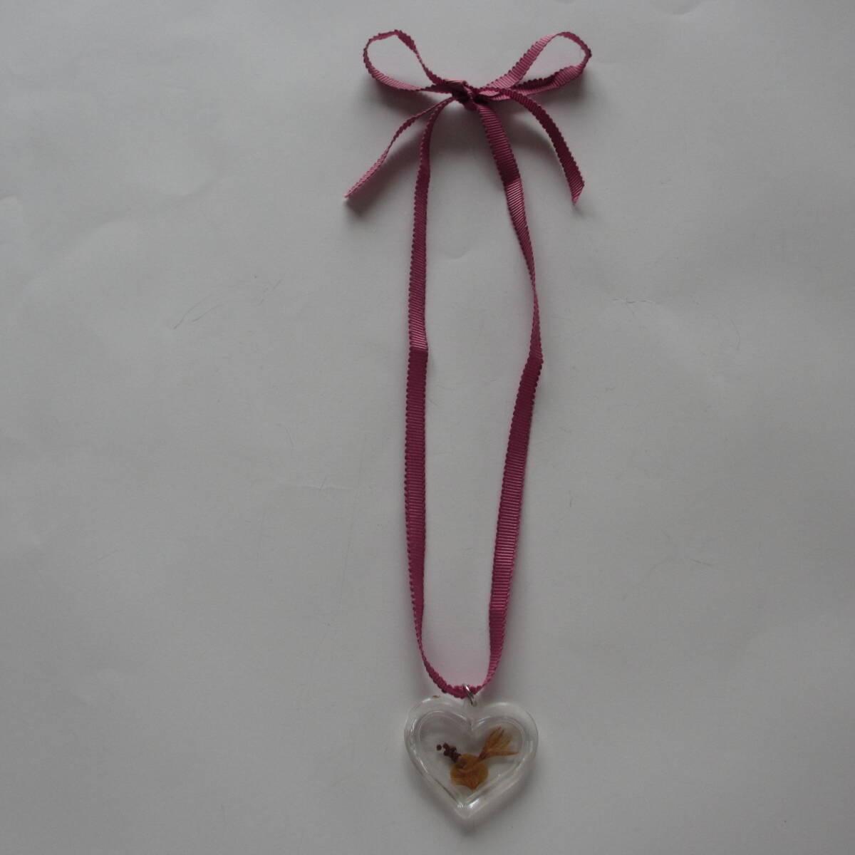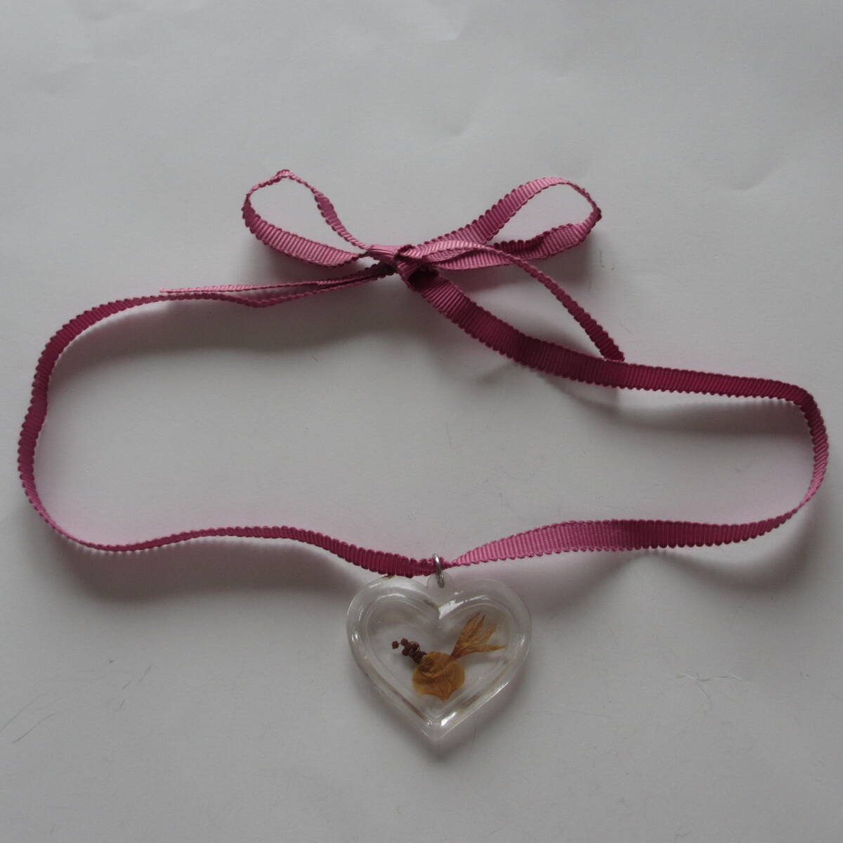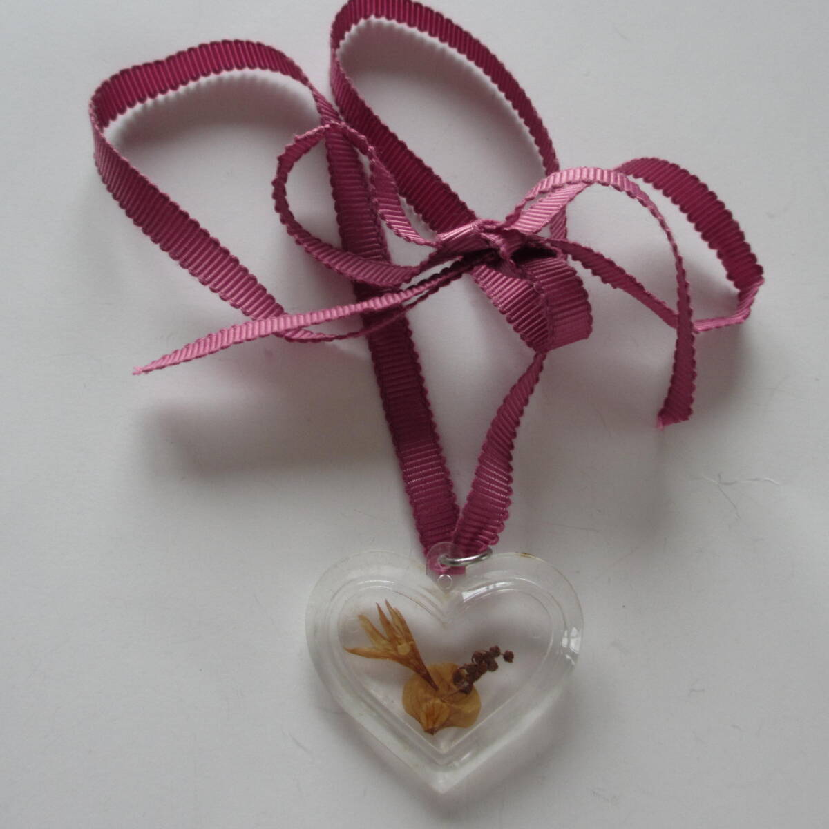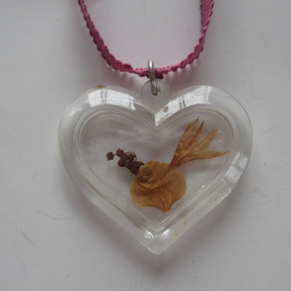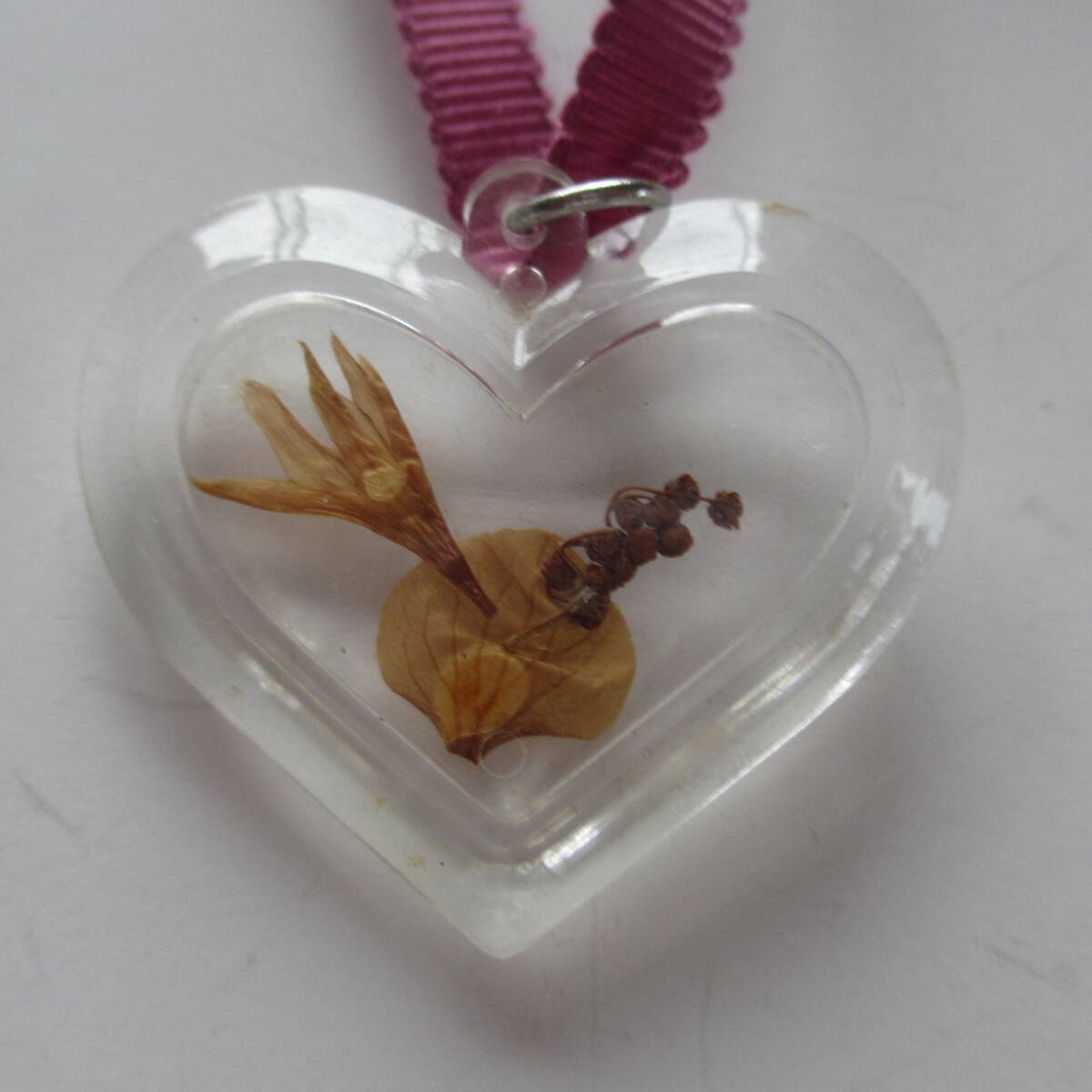 押し花入りのハート型のペンダントトップで、紫がかったピンク系の、