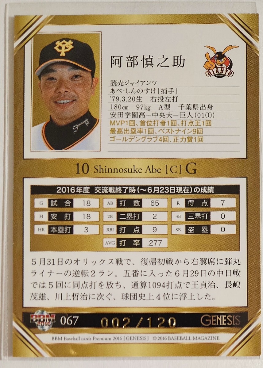 2016年BBM ジェネシス 120枚パラレル 阿部慎之助 巨人 ジャイアンツ
