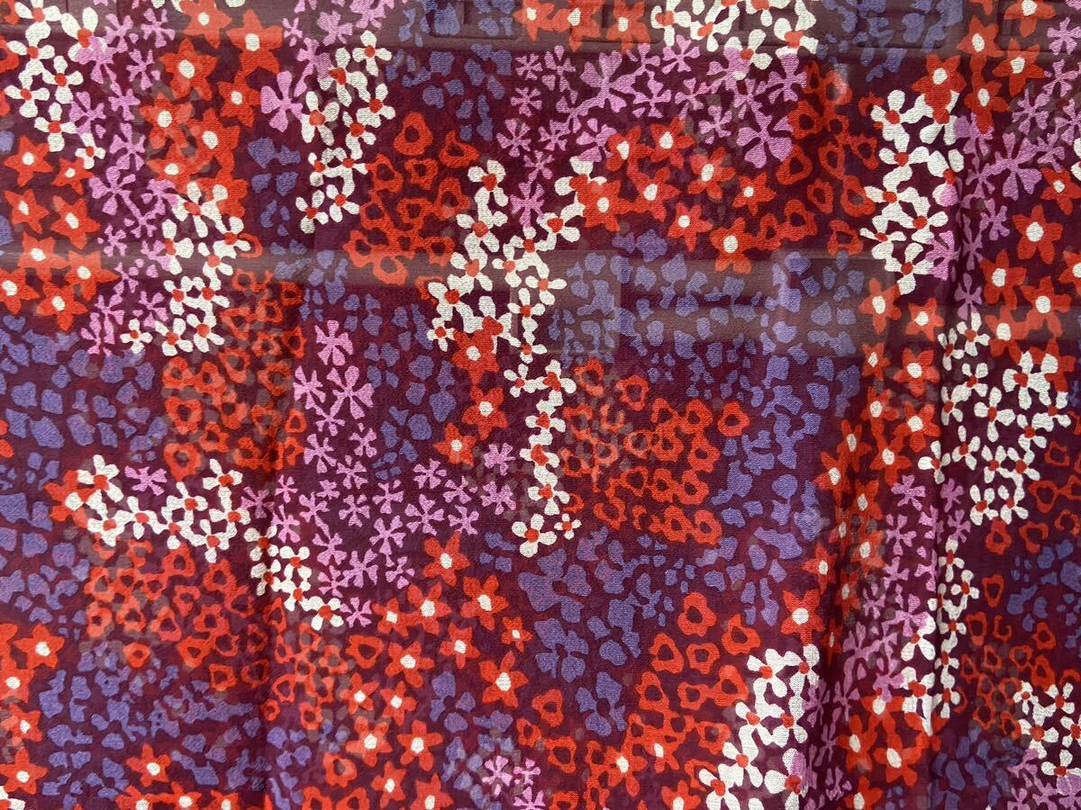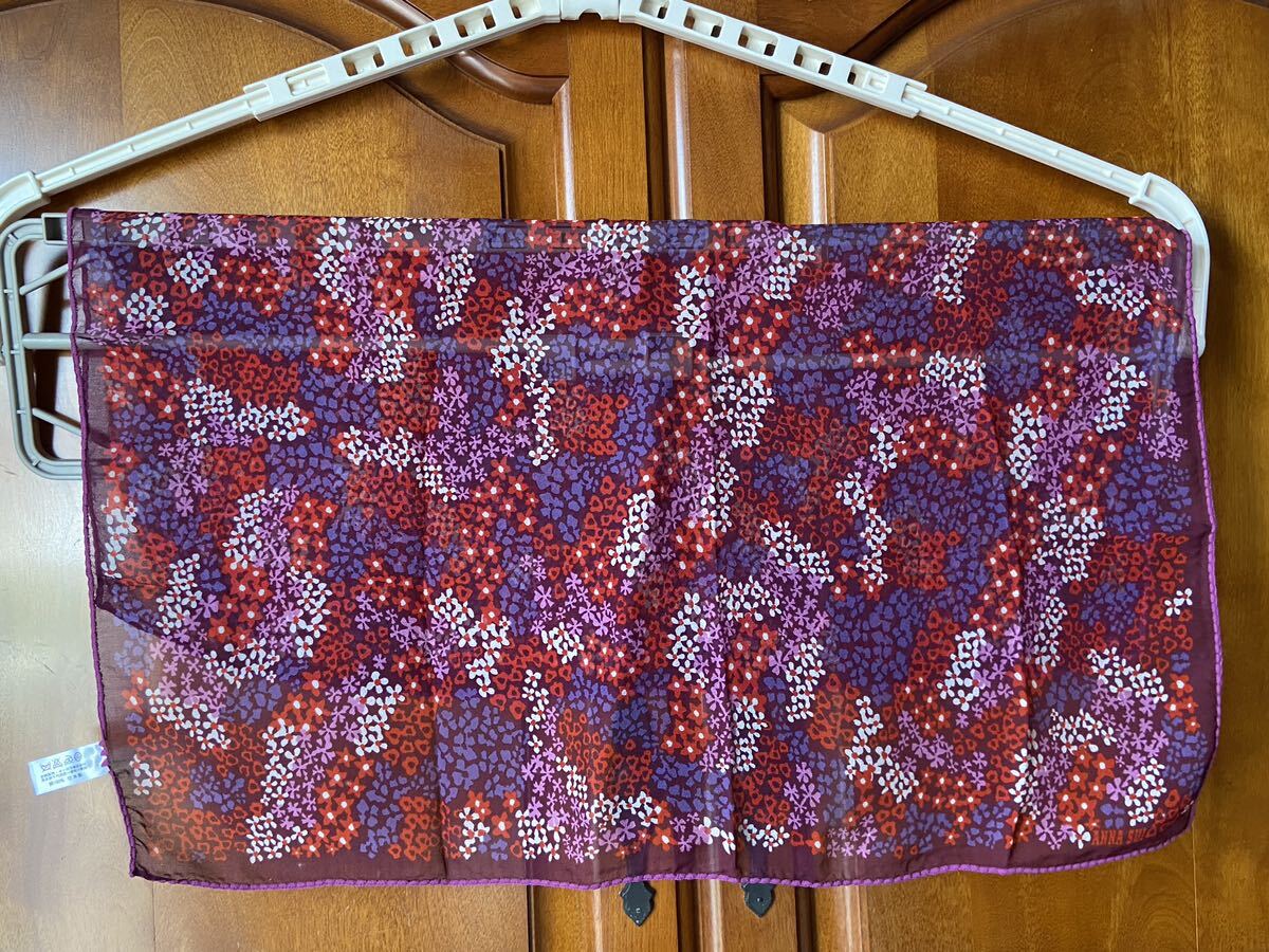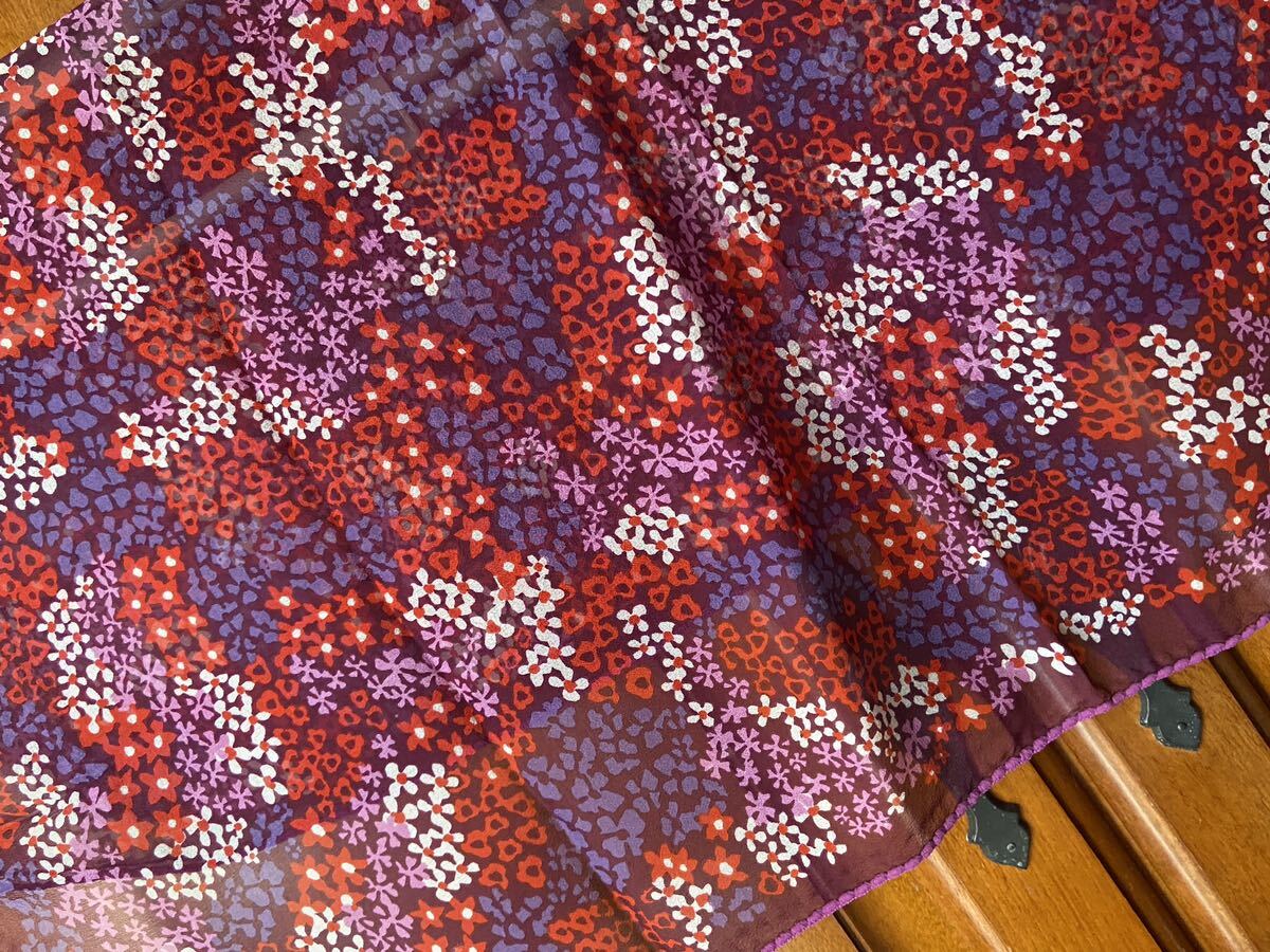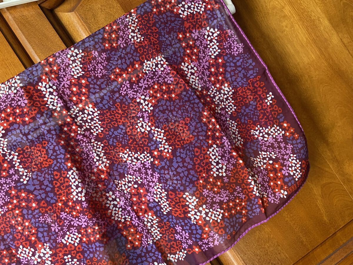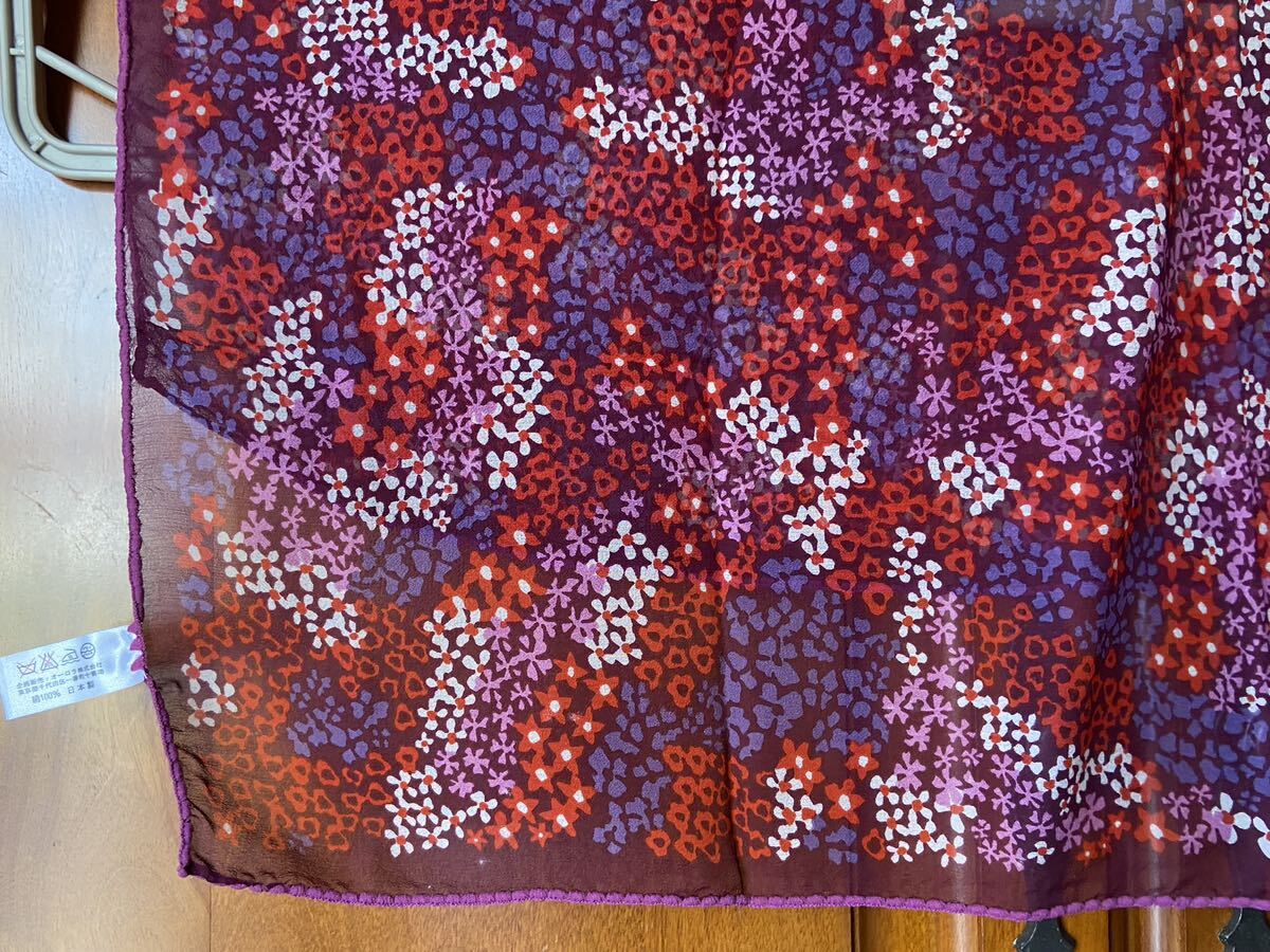 有名百貨店での購入です。オーロラのシルクスカーフ正絹です。紫系統の小花柄です。サイズは56×56センチの正方形です。美品です。