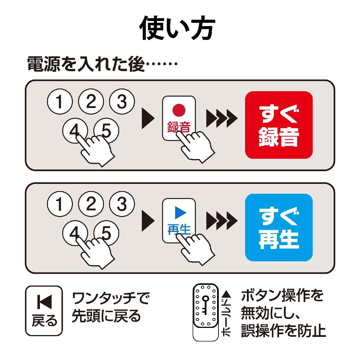 ● 番号ボタンと録音/再生ボタンを順に押すだけの簡単操作